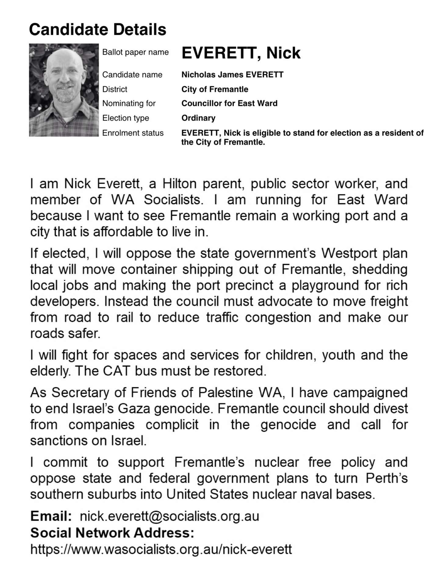 Here’s the Profile lodged by Nick with his formal nomination for Council.