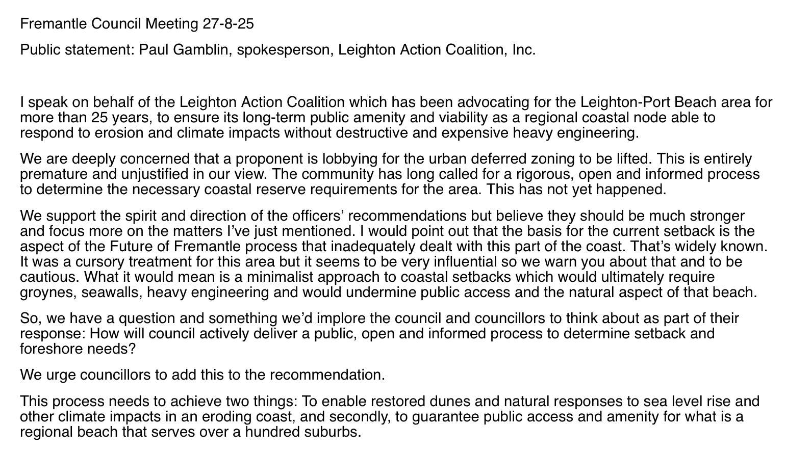 For example, here’s what Paul Gamblin of the Leighton Action Coalition submitted to the City of Fremantle at the Ordinary Meeting of Council of 27 August last.