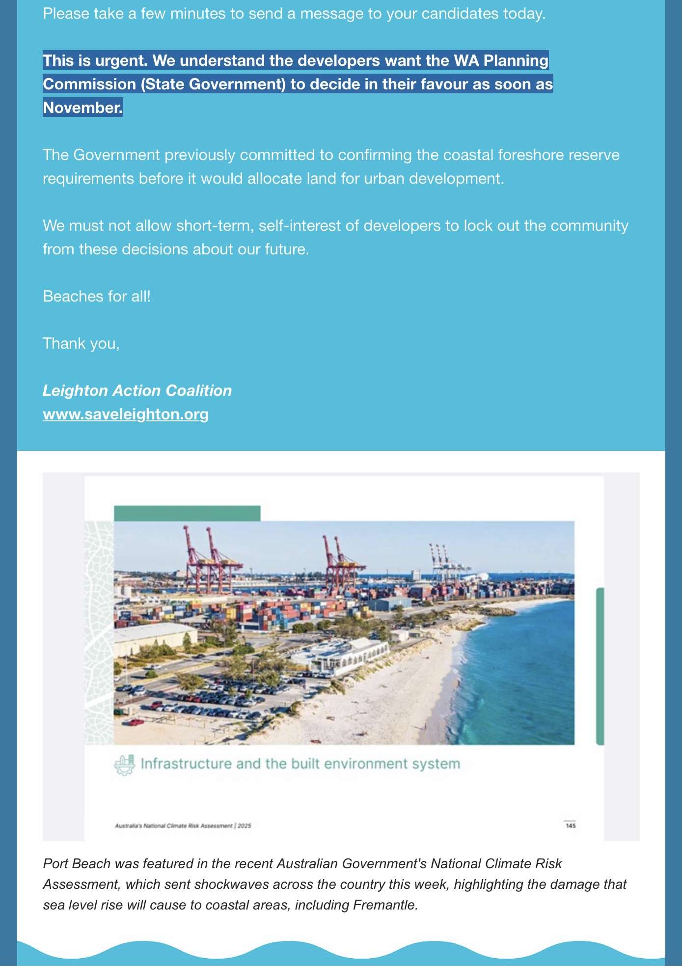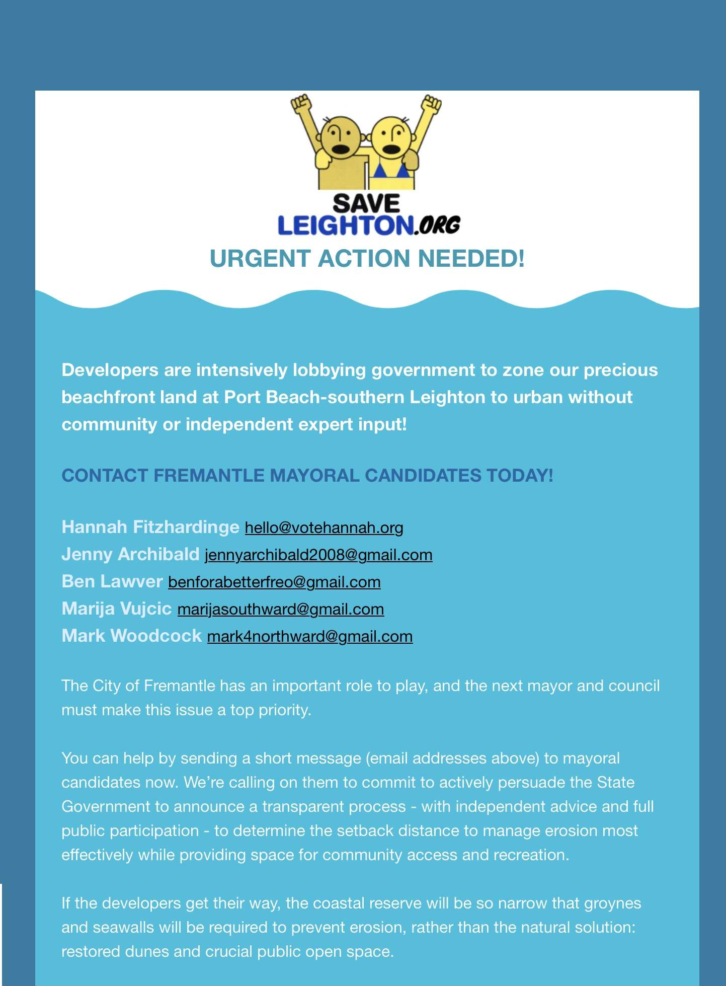 All this has the Leighton Action Coalition on the move again, particularly asking its supporters to write letters expressing their concern at the unseemly haste that the Future of Fremantle project seems to be attended with just now.