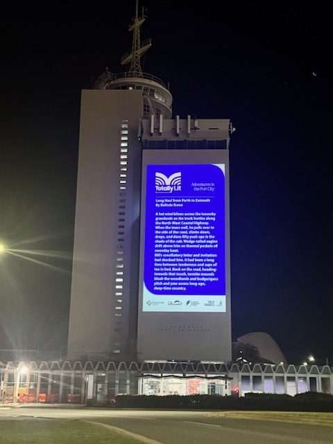 Writ Large will also be continuing to the end of the Festival. Wander down to Victoria Quay on any evening between now and 10 October to enjoy some tiny short stories writ large asflash fiction is projected onto the Fremantle Ports Administration Building.
