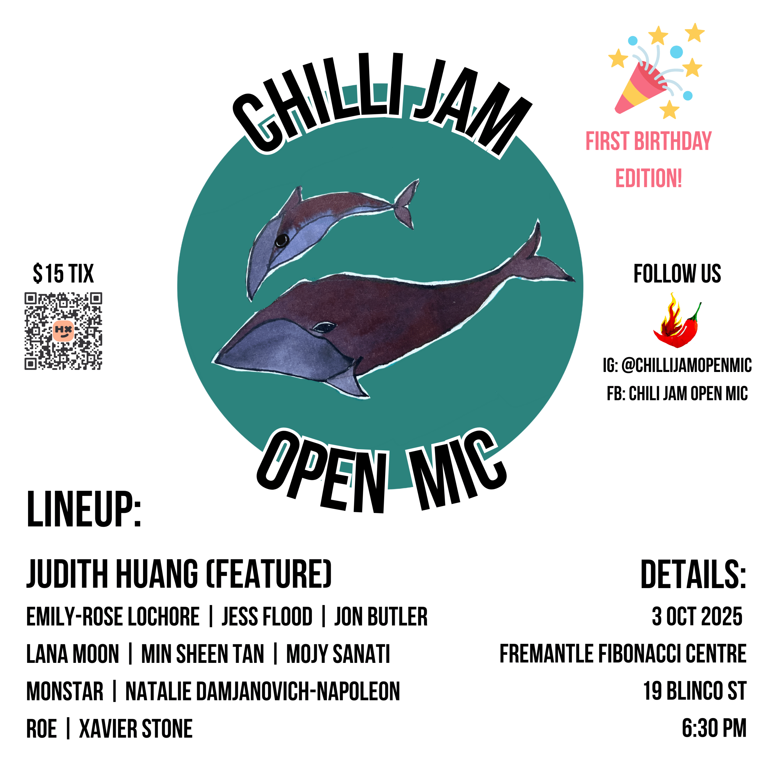 On the first Friday of every month, Chilli Jam invites you to the Fibonacci Centre in Fremantle where emerging poets, comics, and musicians bravely delight you in open mic with beauty, laughs, and beyond.