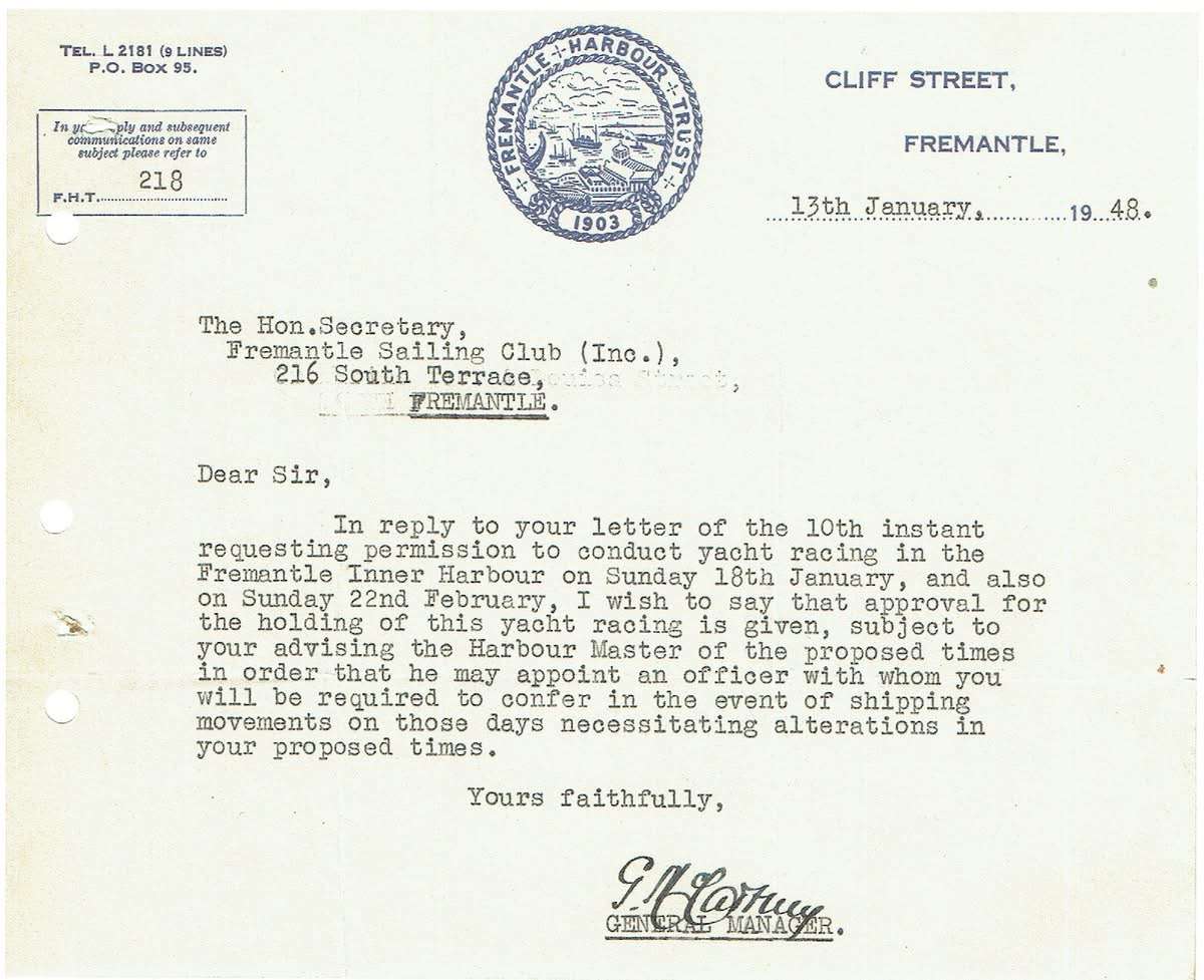 Fremantle Sailing Club recently shared this gem from the archives a 1948 authorisation letter granting permission to hold yacht racing in Fremantle Harbour.