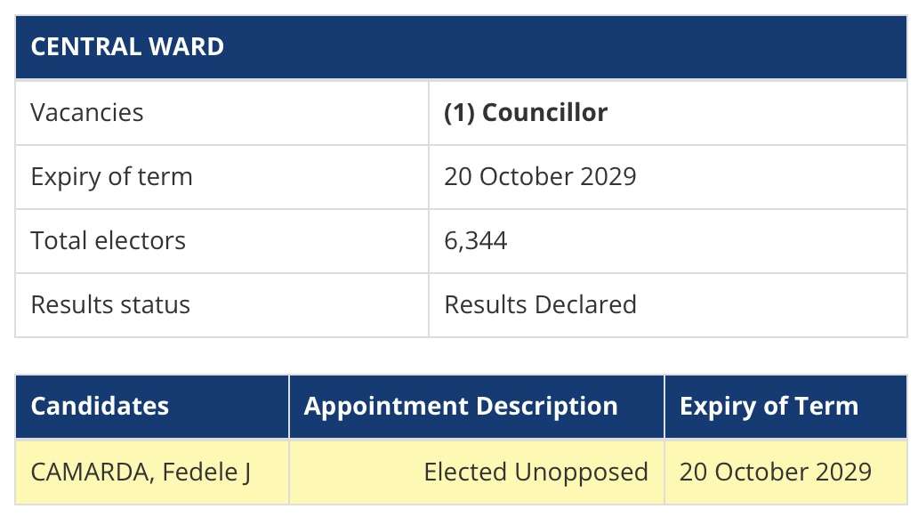 Readers will recall that Fedele Camarda was elected unopposed in Central Ward at the outset of the election period.