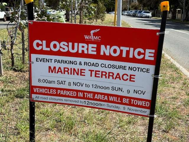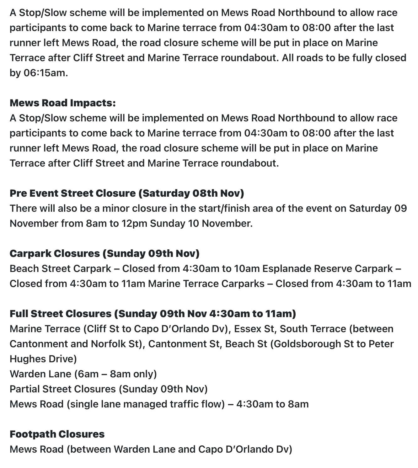 Indeed, the takeaway message for residents near Marine Terrace and visitors to Freo on both Saturday and Sunday, is that Marine Terrace in particular from Cliff to Capo D’Orlando will be submpject to restrictions and on Sunday will be totally closed off to traffic between 4.30 am until 11 am. So you need to make alternative access arrangements.