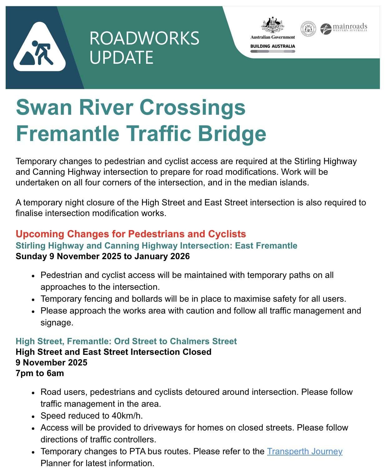 Here’s the latest from Main Roads WA on New Bridge associated things happening on roads around Freo.