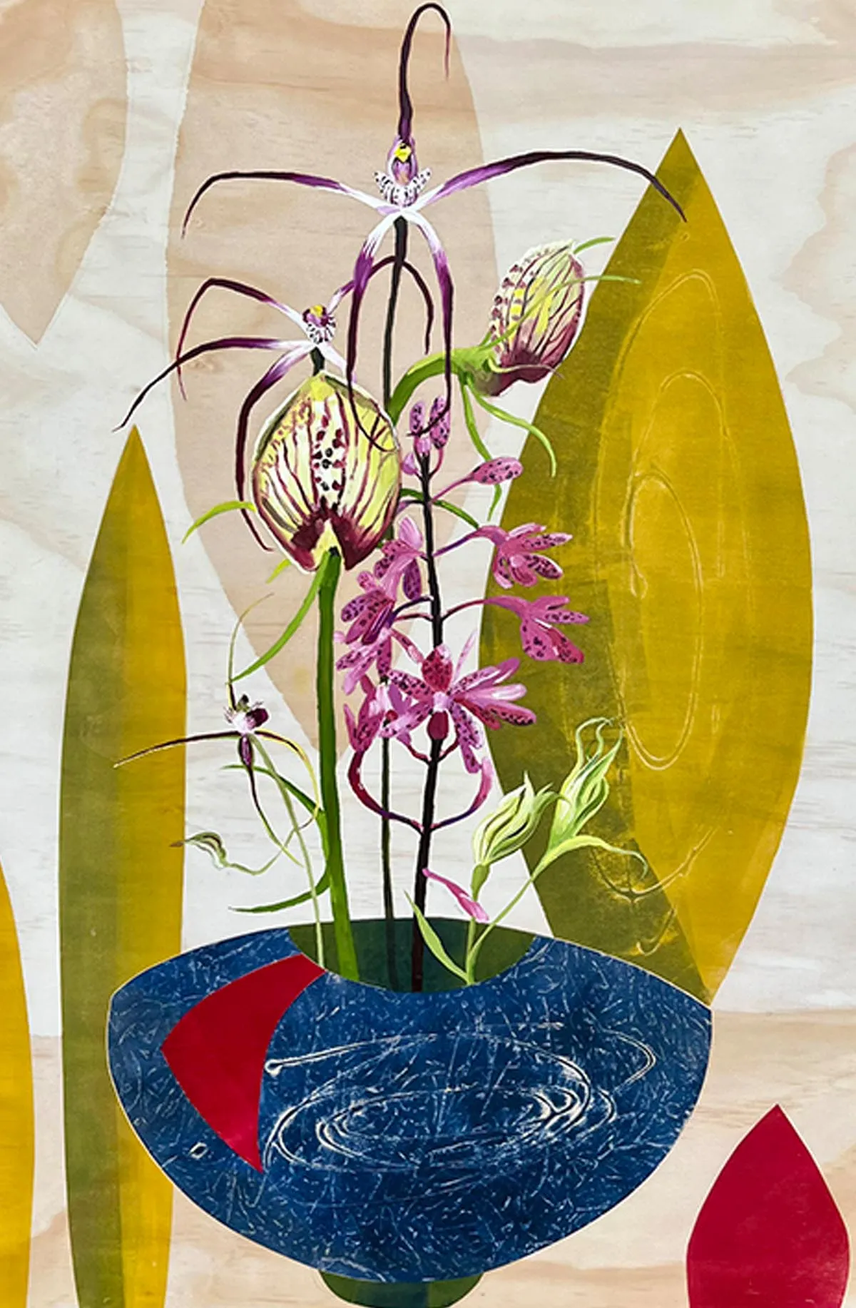 Members engage in a wide range of traditional and experimental printmaking techniques. With opportunities amongst the group for synergies to develop and for members to be inspired by each other’s practice and experimentation – a diverse range of works are produced celebrating colour, line, form, the beauty of abstraction, the natural world and more.