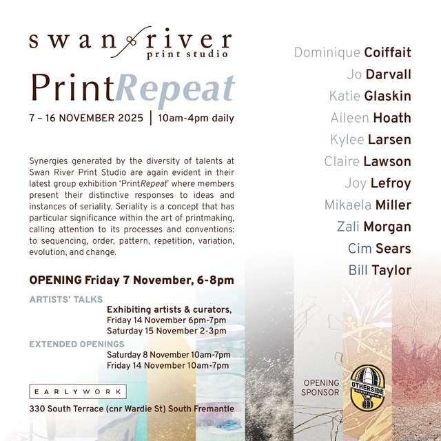 Do you know about Swan River Print Studio? It’s an artist-run initiative dedicated to printmaking founded in 2018. The studio is typically comprised of ten or so core members, with other printmakers regularly using the studio on a sessional basis for special projects, collaborations or workshops.