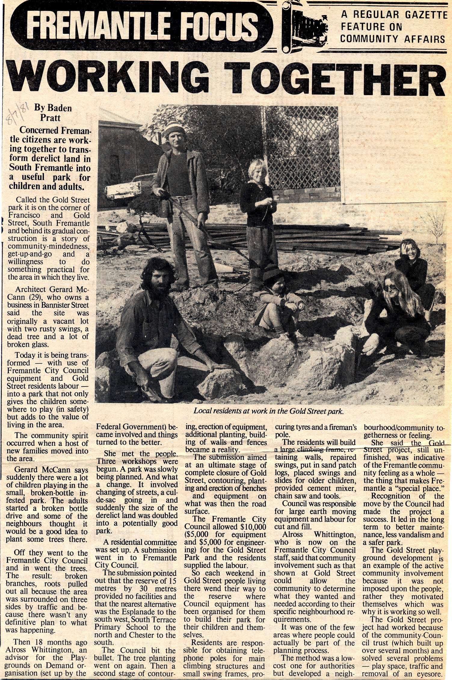 We moved to Gold St in 1977, a new generation of young, part-time working couples and individuals. The population was mainly Italian, with a few Portuguese families. Some older Australian families, Mrs Allison particularly, lived in weatherboard cottages on the sea side of the then abandoned park that sat by the intersection of Gold and Francisco Streets.