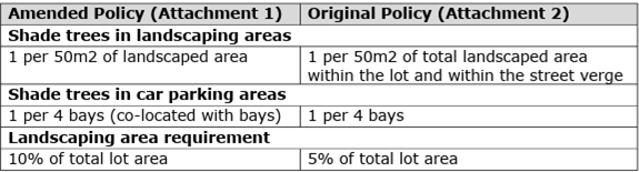 Four comments during the advertising period during 29 August to 19 September 2025 spoke to concerns over potential property devaluation as an outcome of tightening the site cover and landscaping controls, another recommended loosening the shade tree provision requirements to improve views between the street and car parking areas, and another raised concerns about car parking demand in the area. The officer report advised that the requirements only apply to new developments, that discretion on policy can be exercised when deemed appropriate based upon the application, and car parking requirements will continue to apply as usual.