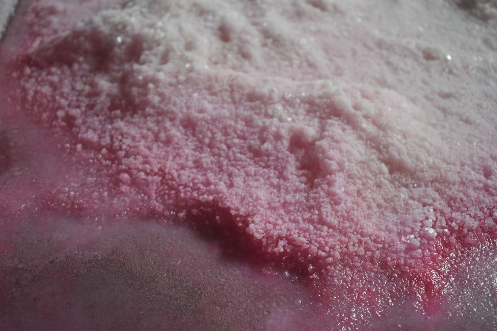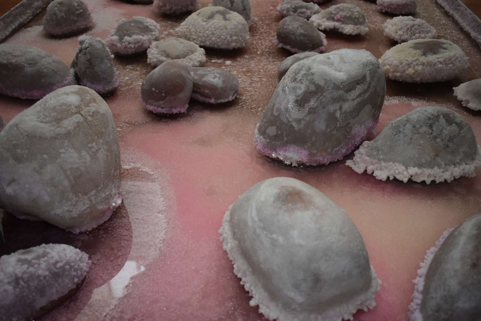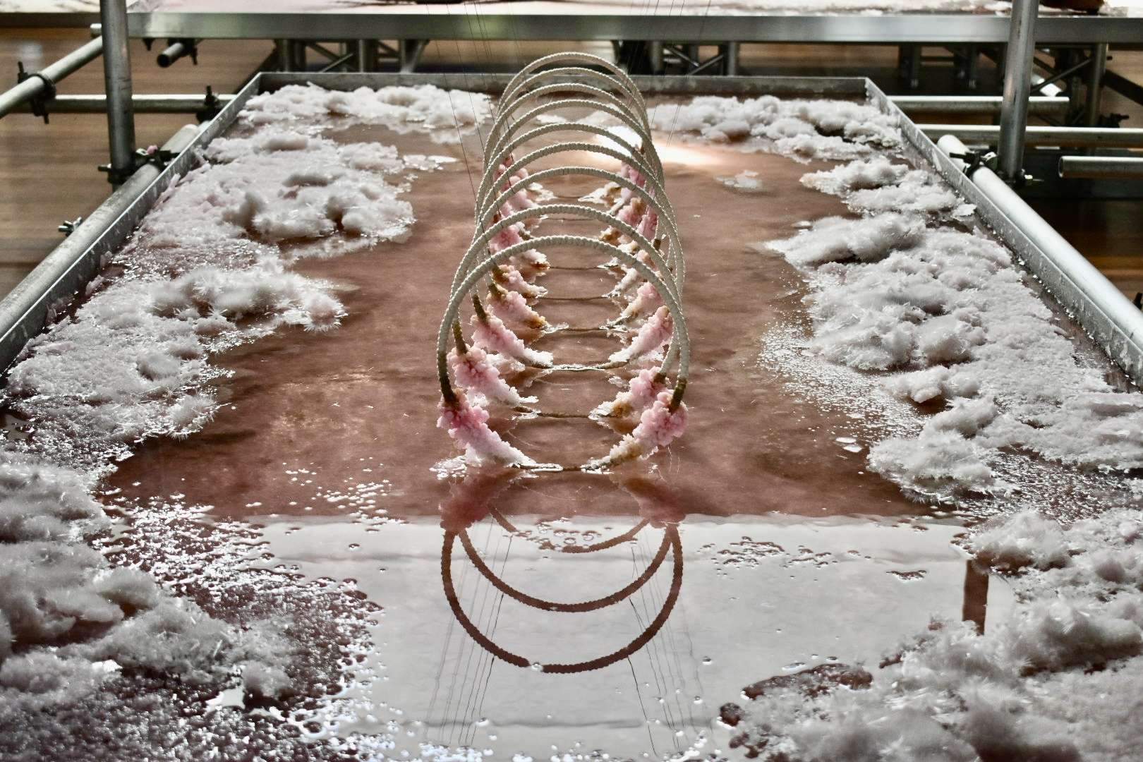 The installation is created using a series of trays with water and crystalline salts and a natural dye to create the pink colour. The salt crystals grow inside the installation – so the pieces evolve; it’s a living and growing artwork.