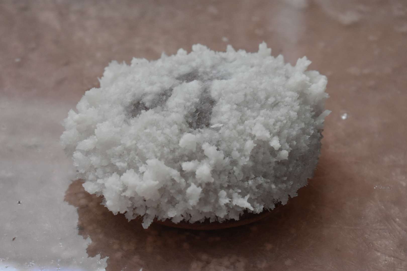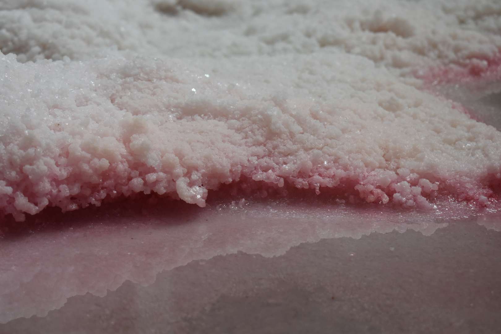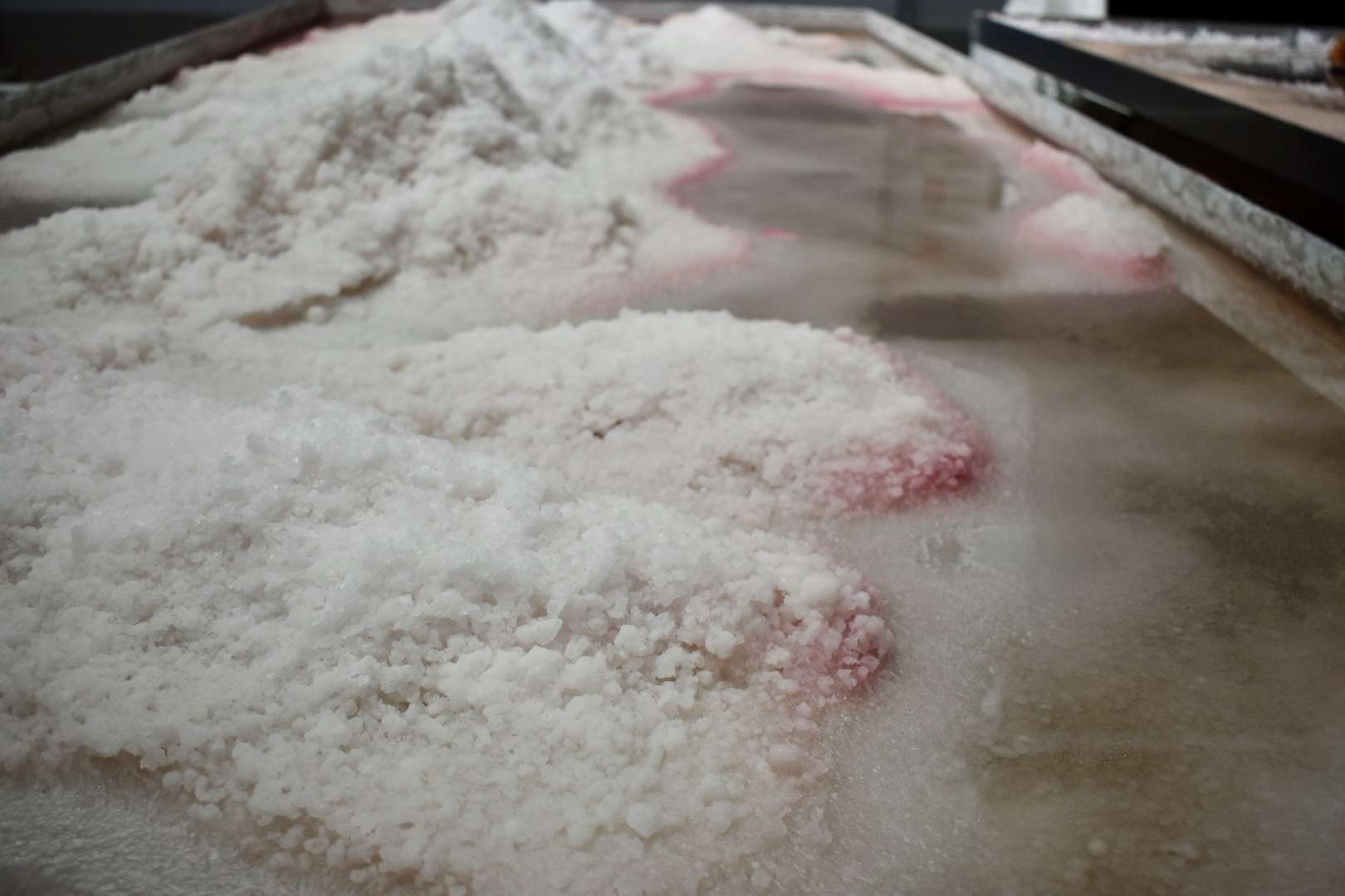 The installation is created using a series of trays with water and crystalline salts and a natural dye to create the pink colour. The salt crystals grow inside the installation – so the pieces evolve; it’s a living and growing artwork.