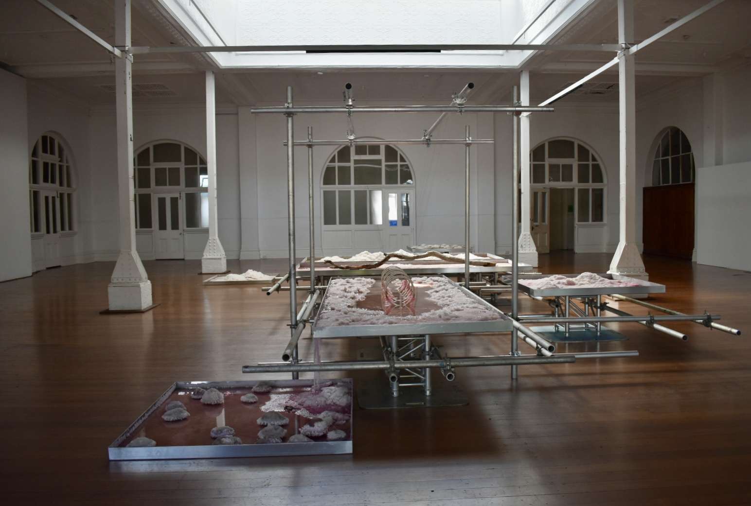 Conceptually, the installation reflects on human-nature relationships, extraction, ecology, and how “nature itself is consumed as spectacle.” By bringing pink-lake-like environments into a this old building, the work also comments on colonial and early federation histories and our impact on natural landscapes.