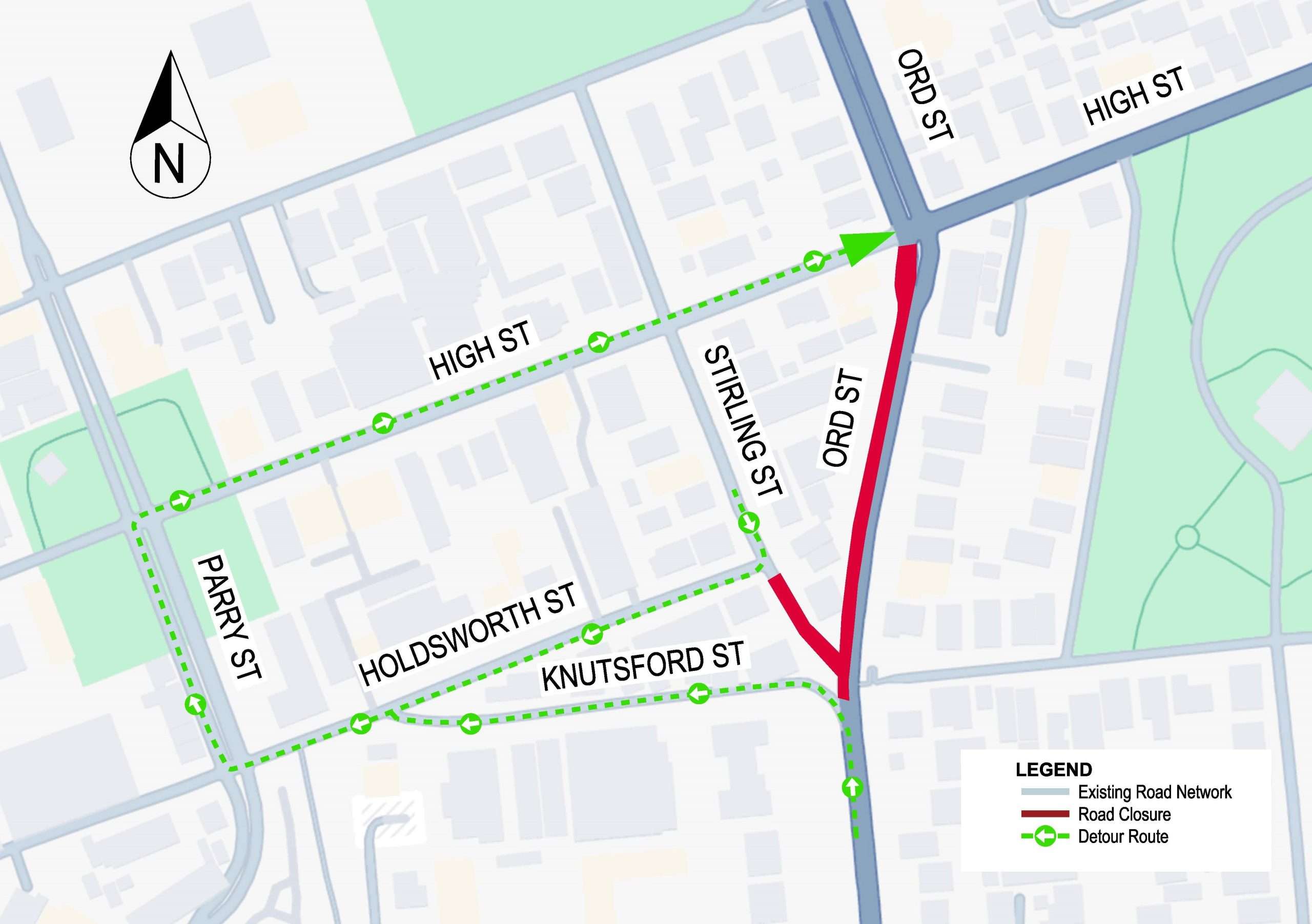 - Full closure of Stirling Street, from Holdsworth Street to Knutsford Street.