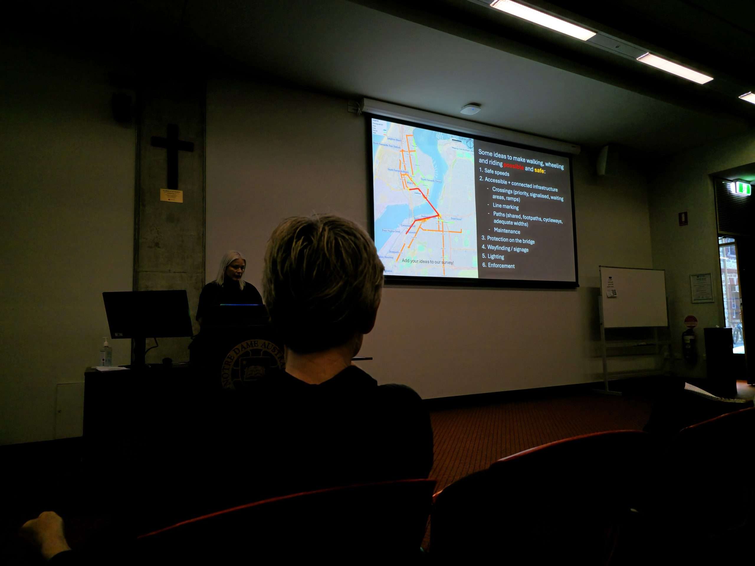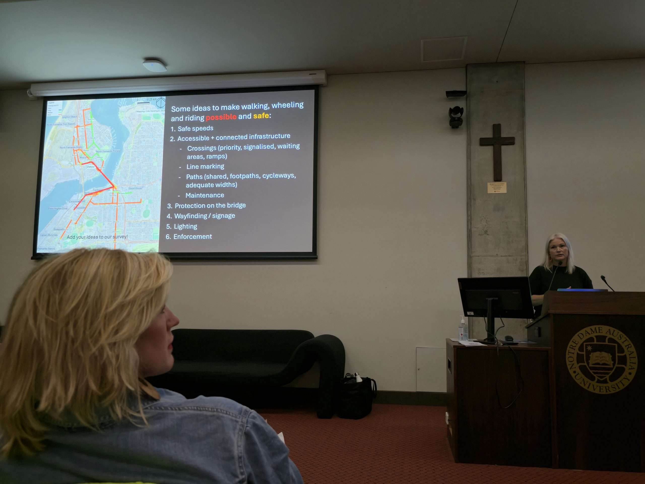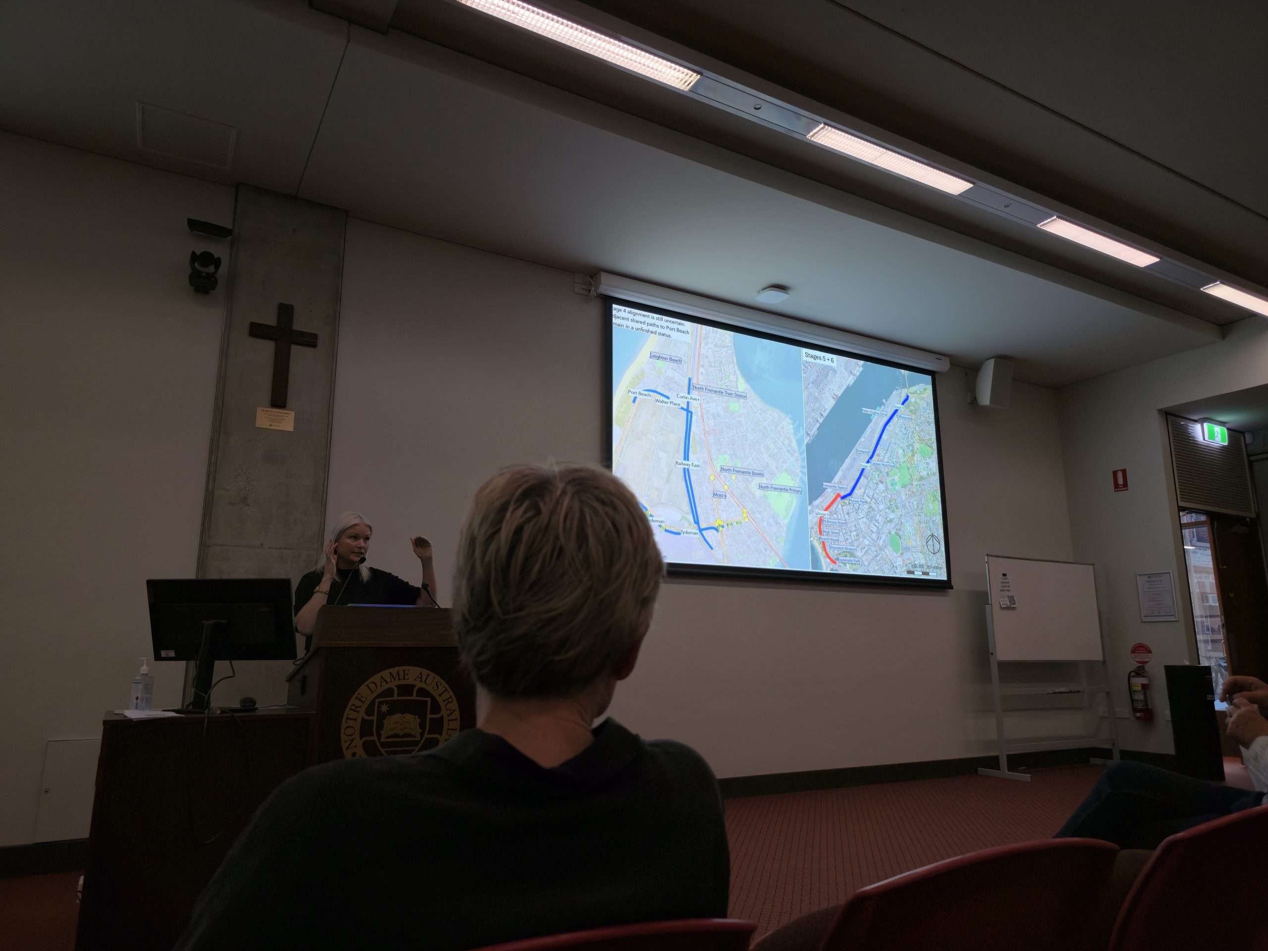 There is clear consensus from tonight’s audience echoed by the speakers including Dr Annie Matan: communities feel ignored and dismissed by the State Government. We have lost our CAT bus yet areas such as Scarborough have transit fully funded by the State. Main Roads has vast, unchecked power and prioritises cars to the exclusion of all other commuters yet due to their own staffing shortages their assessment timeframes for locally proposed solutions are slow and protracted. Cycling in North Fremantle is unsafe and getting worse with the Fremantle Traffic Bridge works. This feedback has been provided consistently for decades and has fallen on unsympathetic ears. But there are many small interventions, or “low hanging fruit”, that could be implemented even on a trial basis to improve the matter, argues Dr Annie Matan from FreoBUG. That includes “wombat crossings”, shared “slow streets”, and better wayfinding signage. Our recent write up by Shipping News editor Michael Barker provides further detail here.