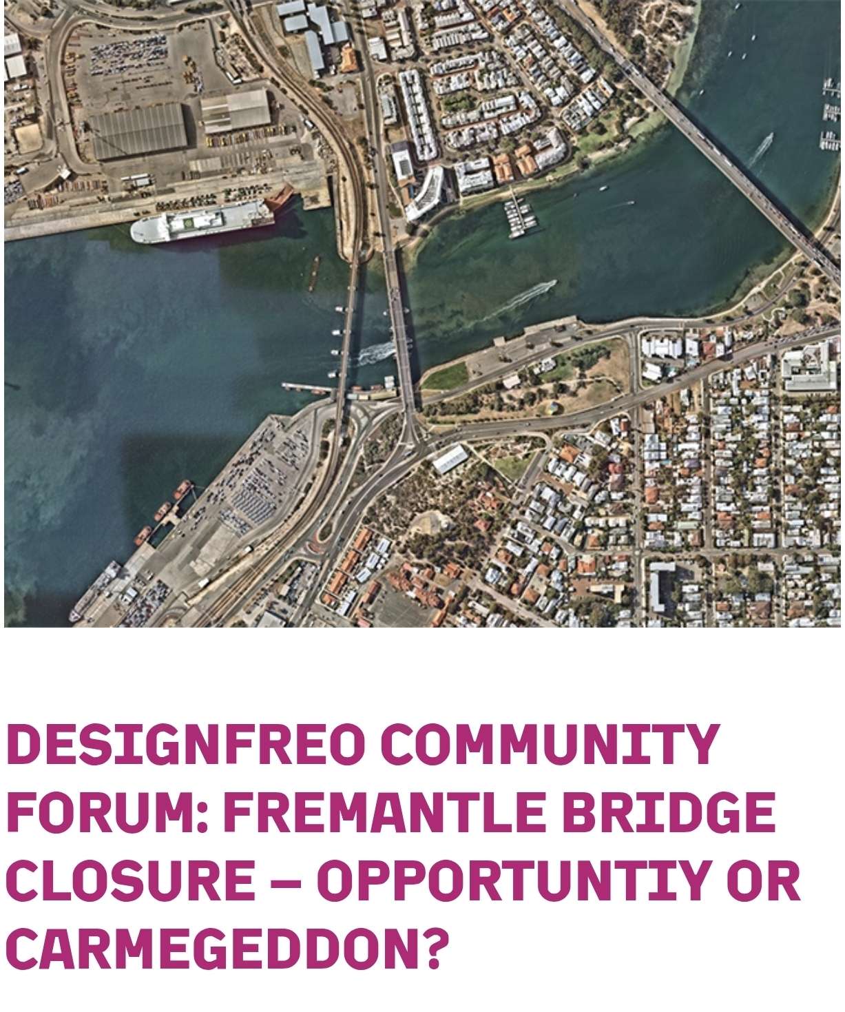 Thursday night 27 November at Notre Dame Tannock Hall for DesignFreo Community Forum: Fremantle Bridge closure – opportunity or carmageddon?