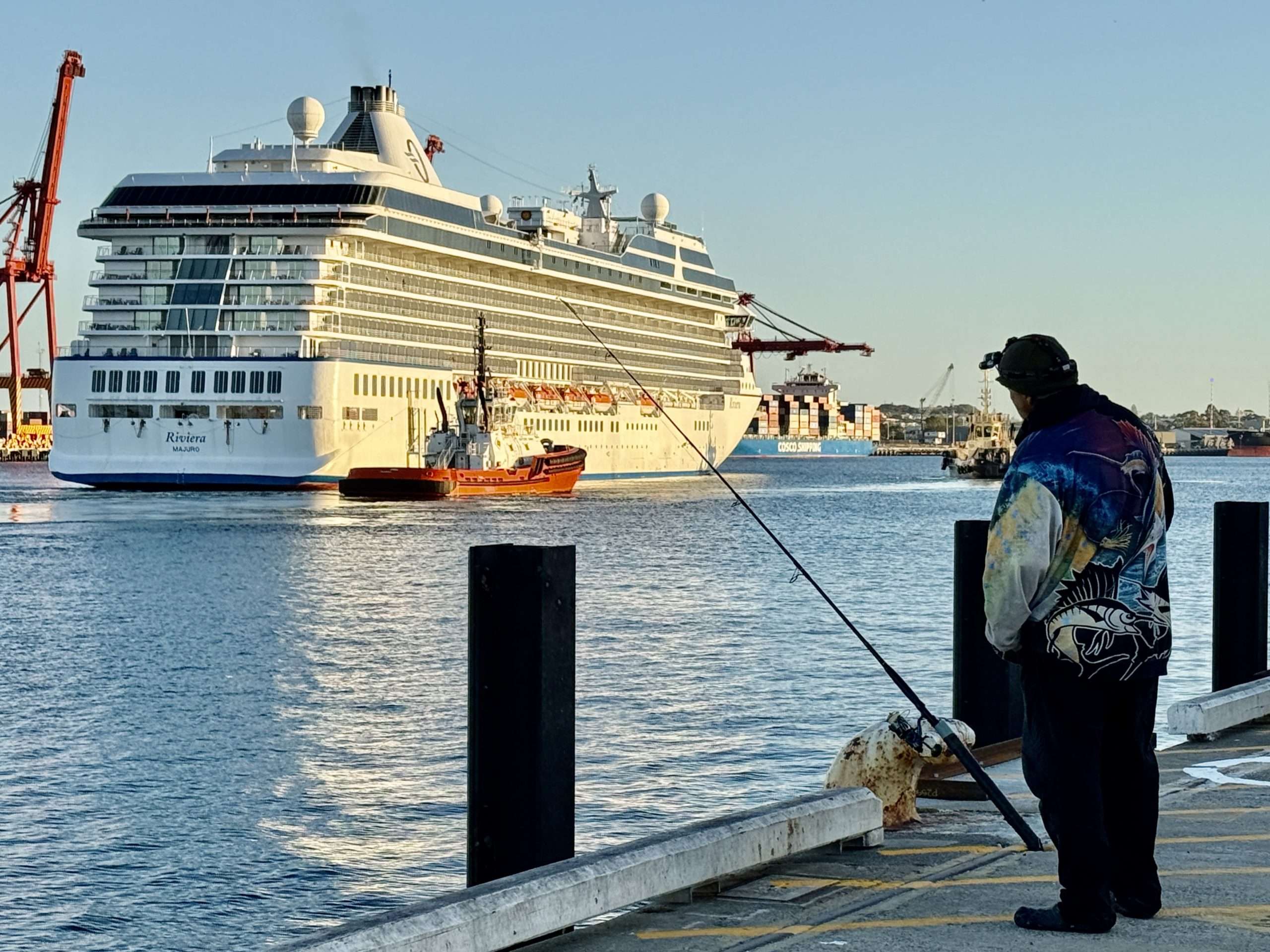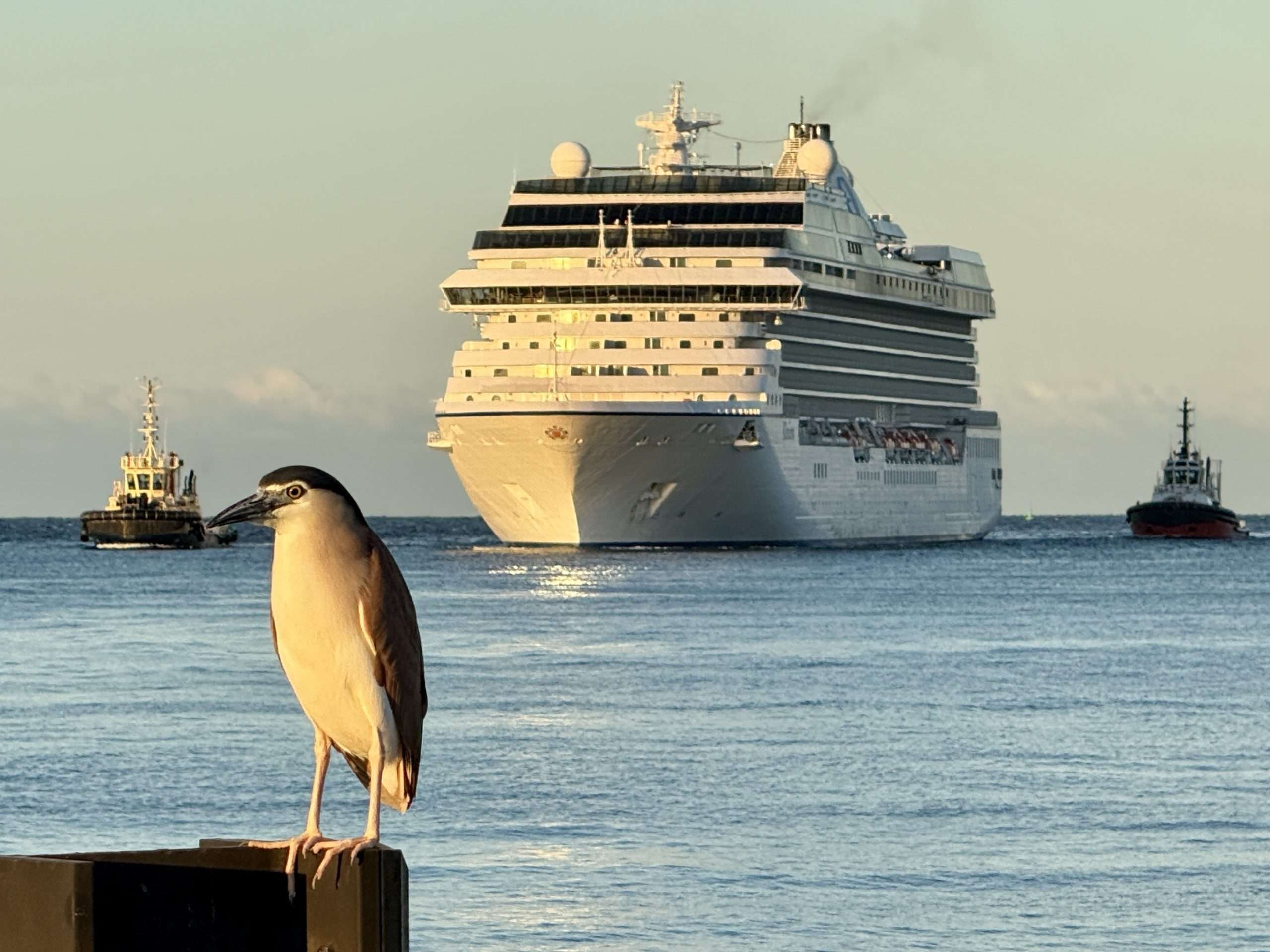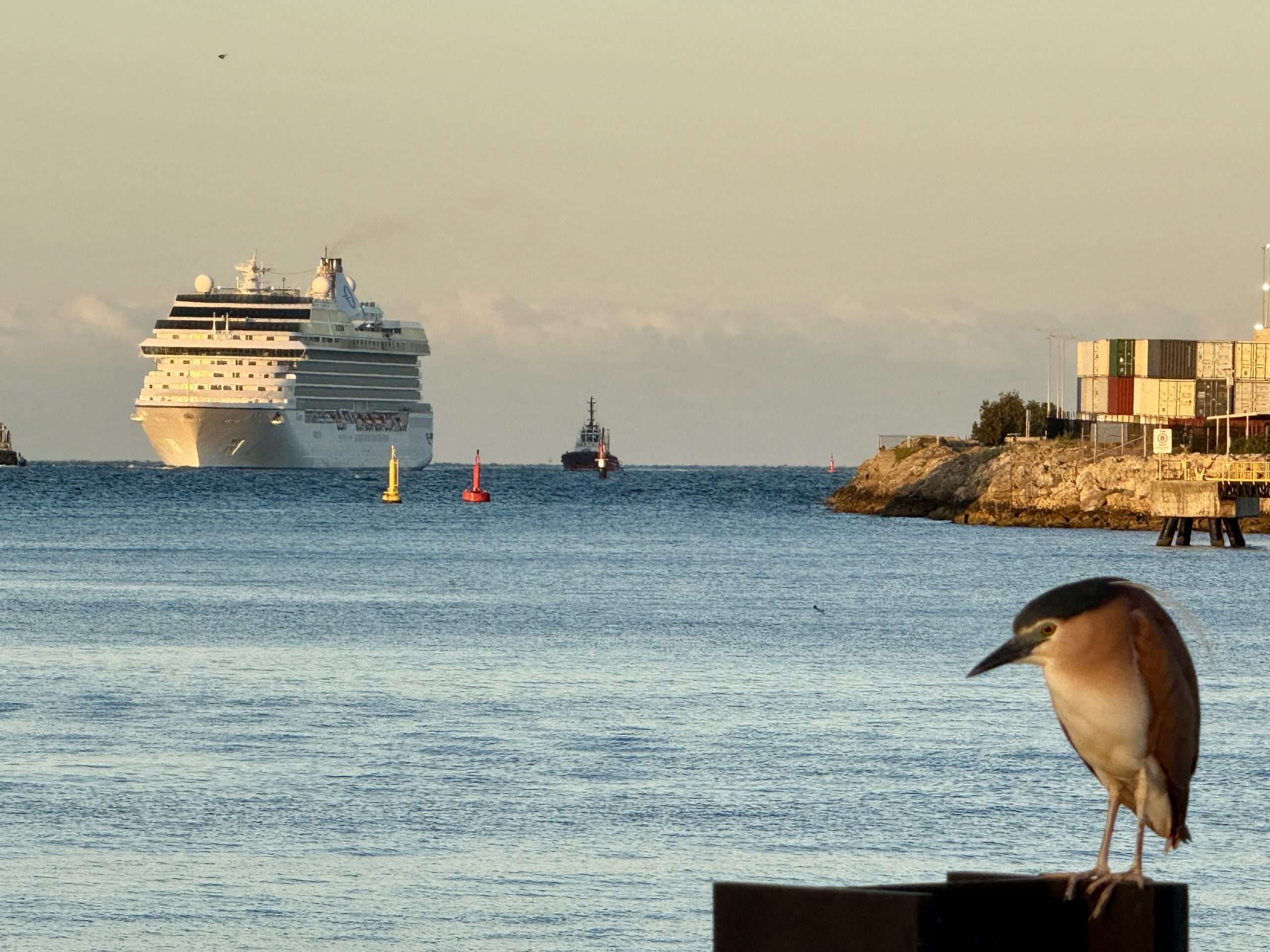 It was quiet at Victoria Quay at 5 am this morning. Just a lone fisherman, three night herons and myself beneath a powder blue sky as Riviera slipped into port.