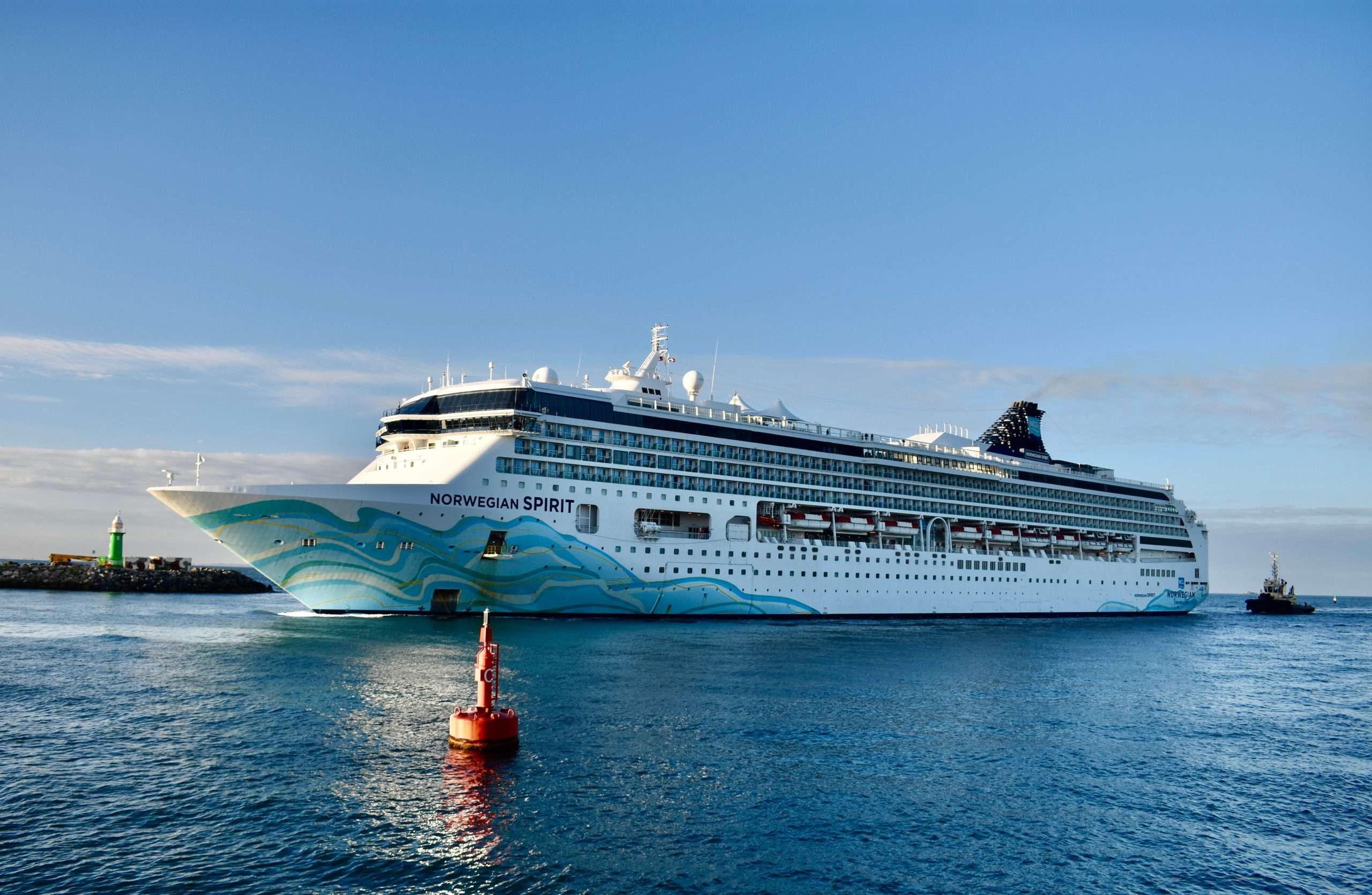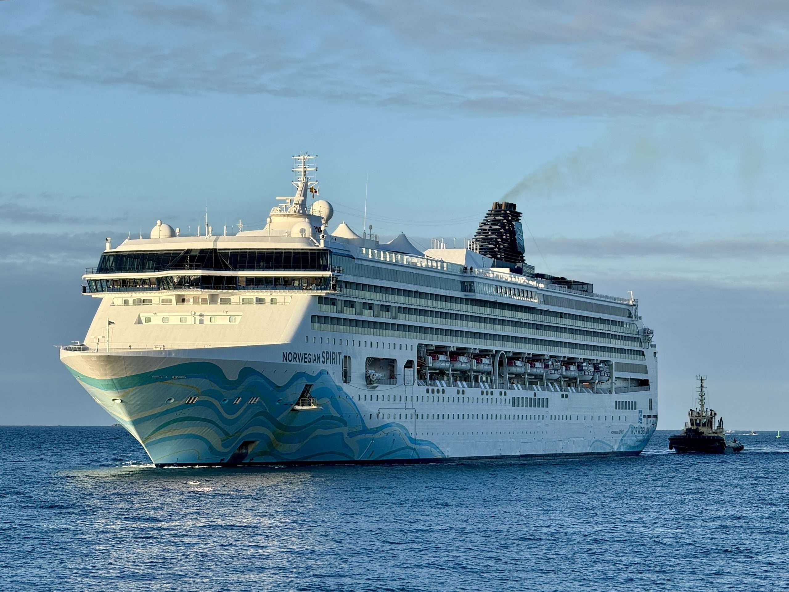 This morning at 6 am, Norwegian Spirit cruise ship drew into Fremantle Harbour – her first-ever visit. Her dynamic hull art, turquoise and blue wave-like patterns, skimmed over the water.