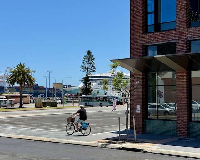And here she is tied up at the famous Fremantle Passenger Terminal this morning, almost in the heart of Freo, along with bikes, buses and cars!