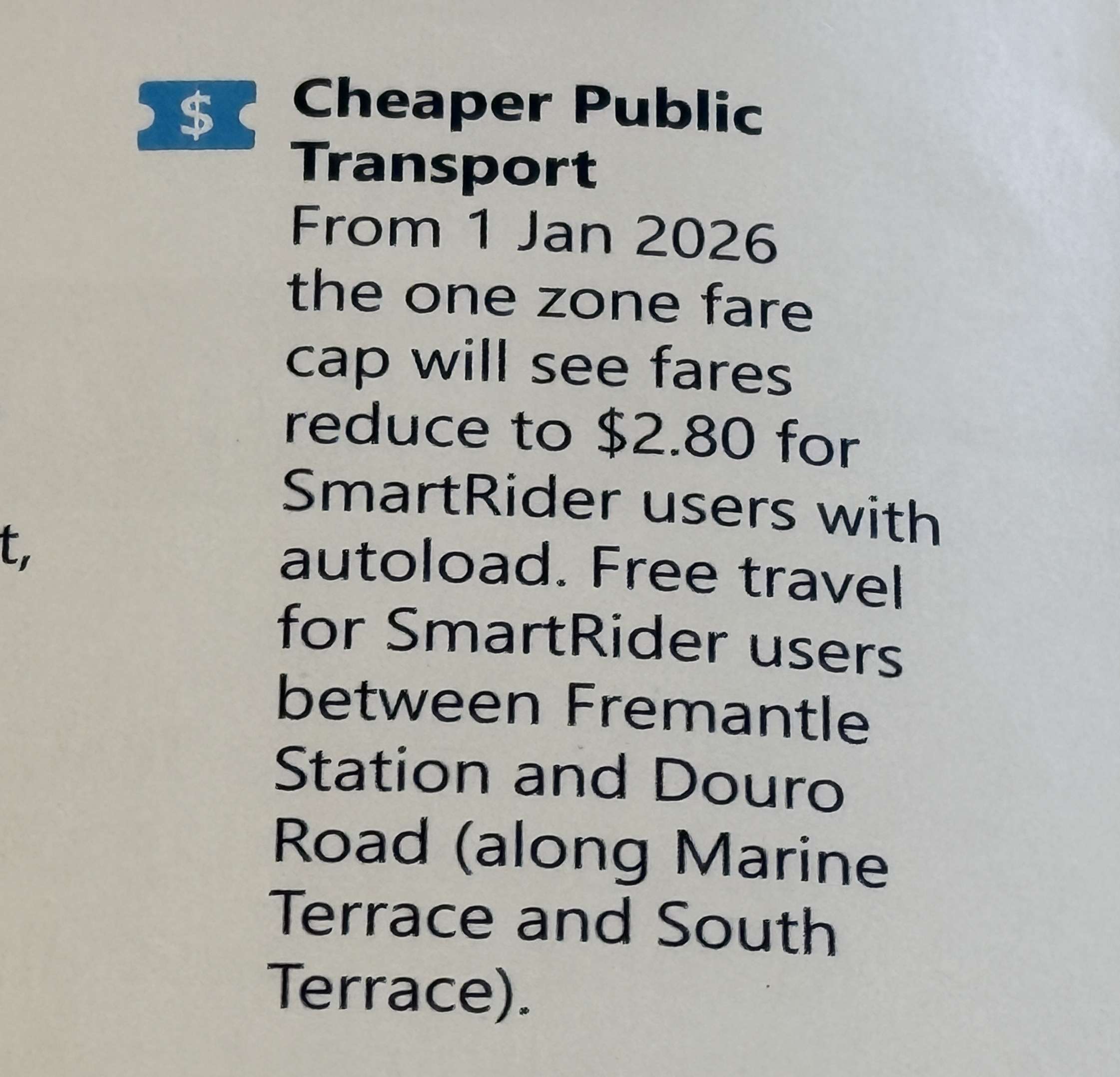 When said reader then told me how excited she was to read this, I voiced some uncertainty because it seemed at odds with what Rita – Deputy Premier Safiotti, that is – had announced earlier, that the free buses would be those running to the Station along South Terrace and that no mention was made by Rita about a Marine Terrace bus. Said reader, a little impatiently, then told me to re-read the relevant bit of brochure, which she promptly emailed to me to make sure I did.