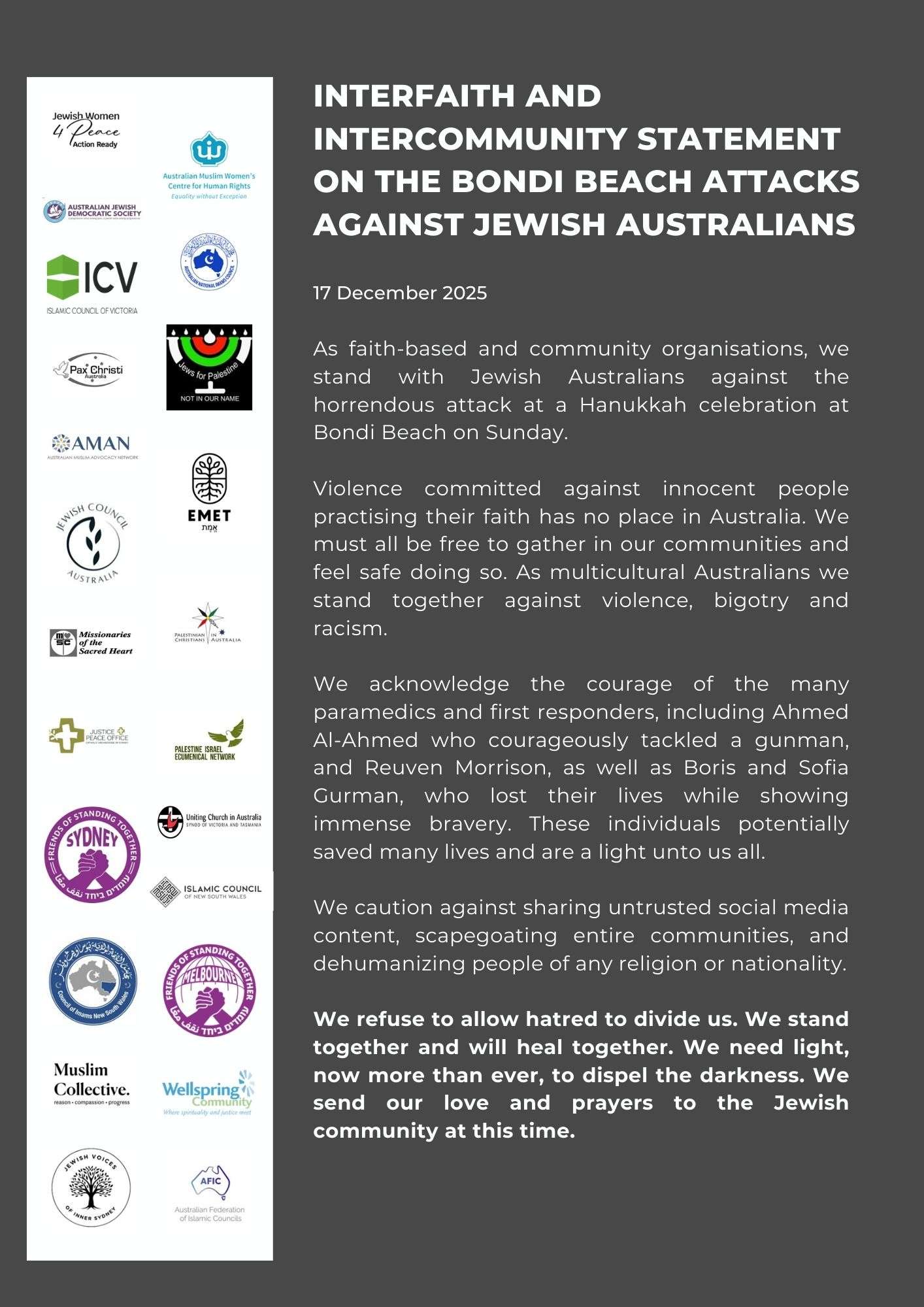 We are pleased to share this Interfaith and Intercommunity Statement on the Bondi Beach Attacks Against Jewish Australians, which as you can see has the support of some 23 significant Australian interfaith and community organisations and was shared by them yesterday.