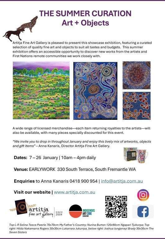 Artitja Fine Art Gallery in South Fremantle is about to open its THE SUMMER CURATION | Art + Objects exhibition at Earlywork, 330 South Terrace, South Fremantle, showcasing a diverse selection of fine art and objects drawn from the gallery’s current collection, including some newer arrivals.