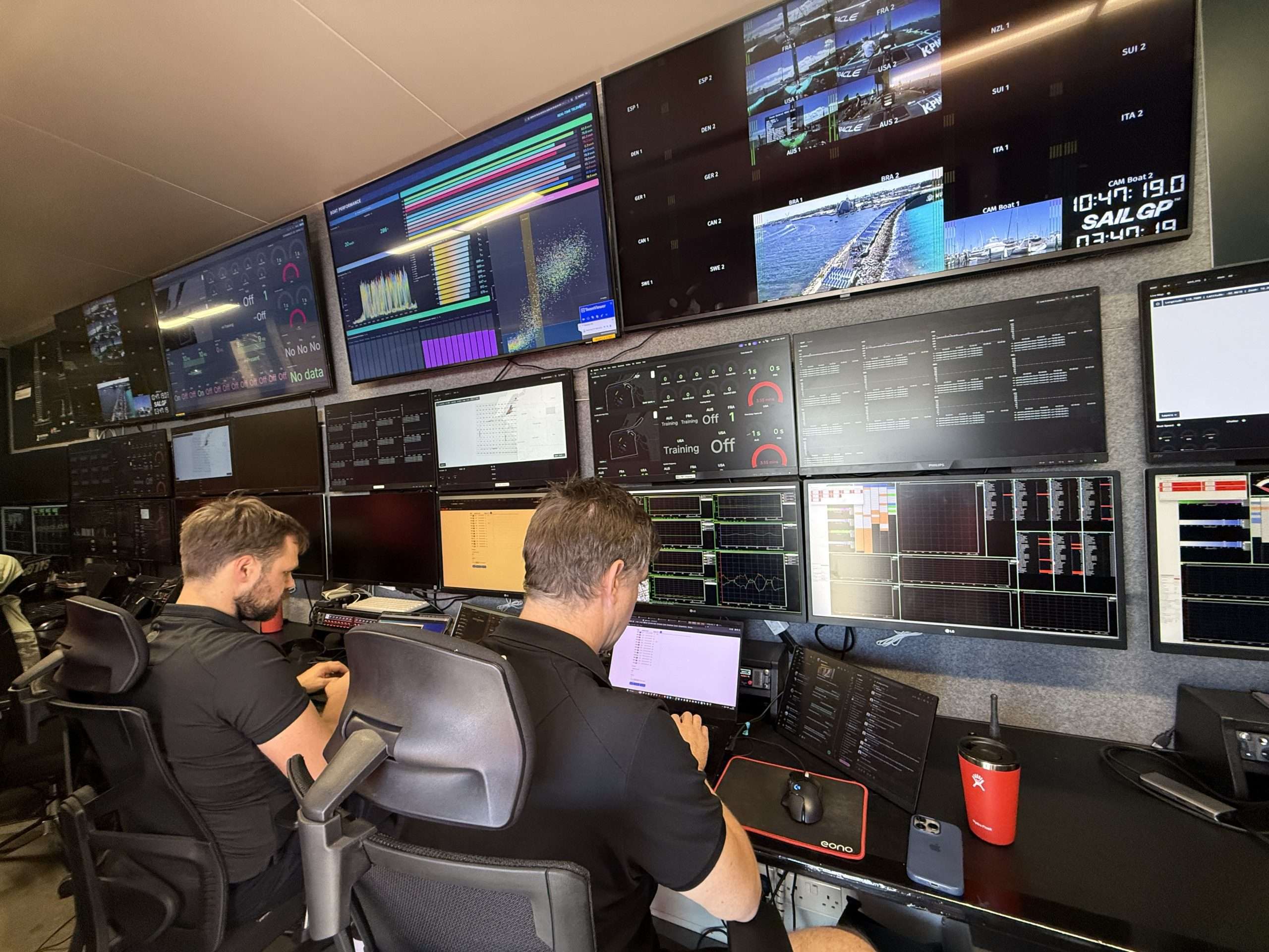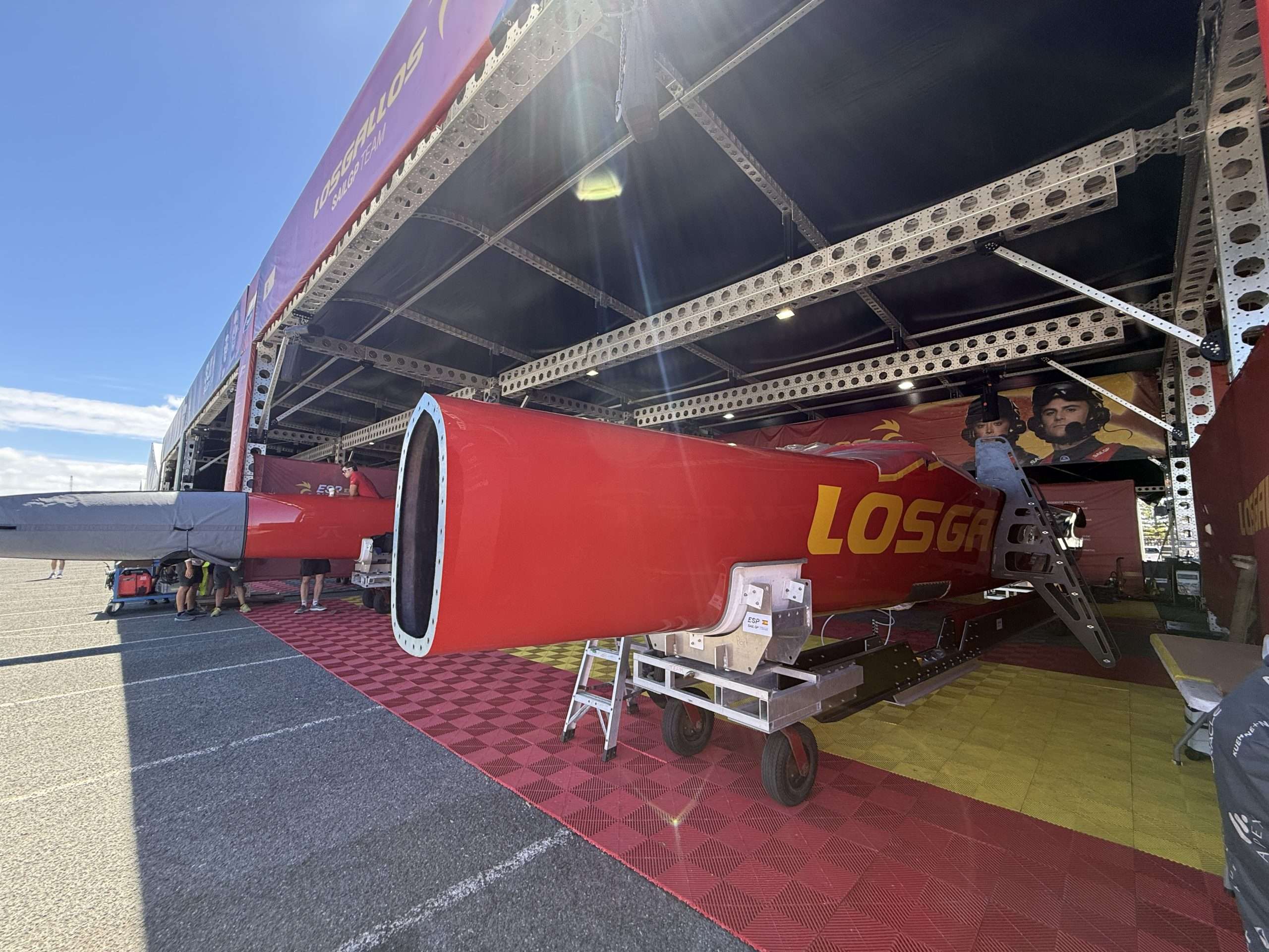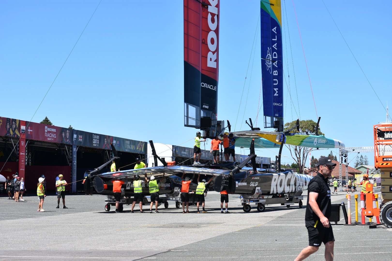 At the Tech site, crews assemble the 12 boats for today’s race. All are filled with identical sized foils in preparation for 24k winds.