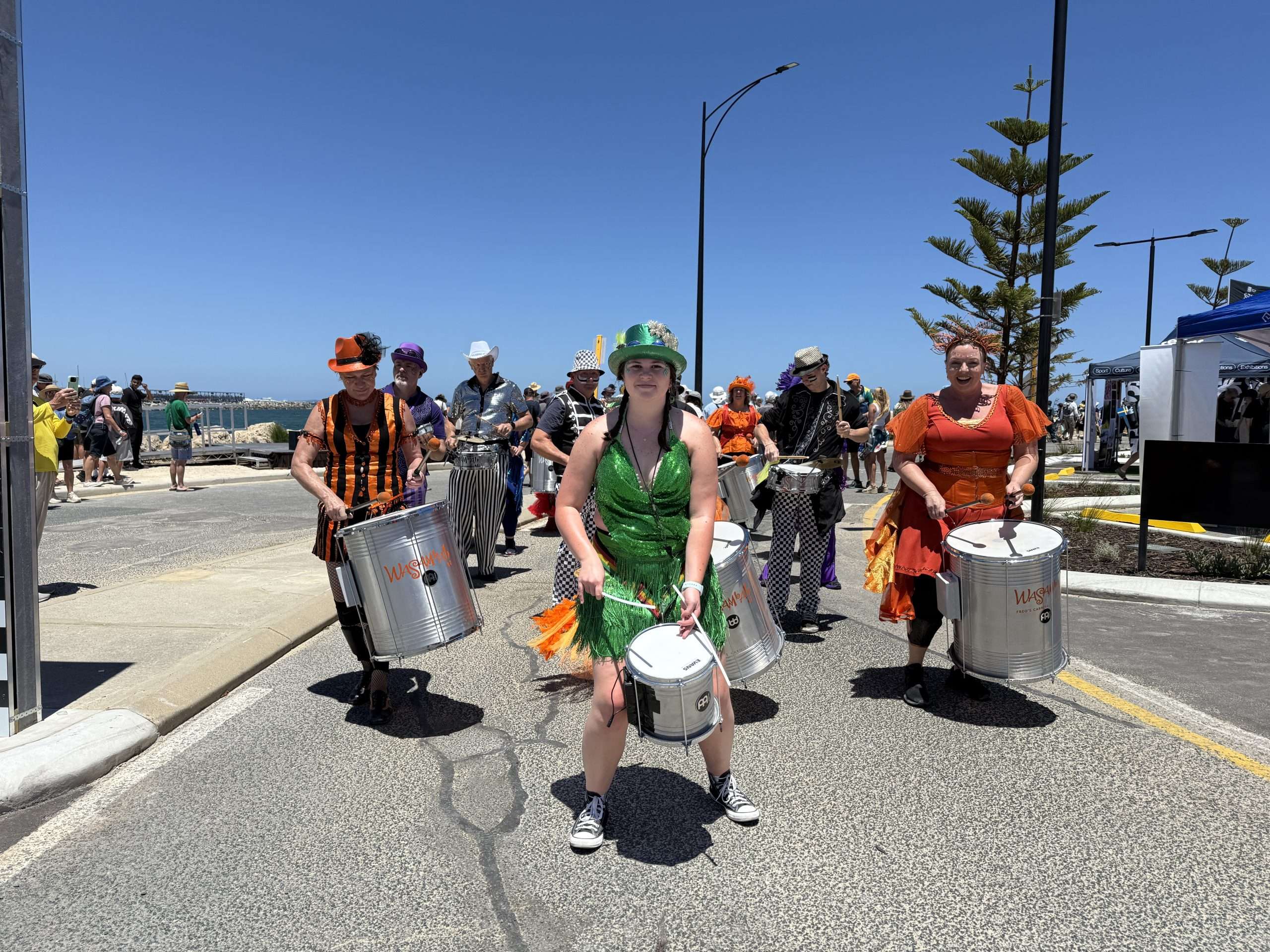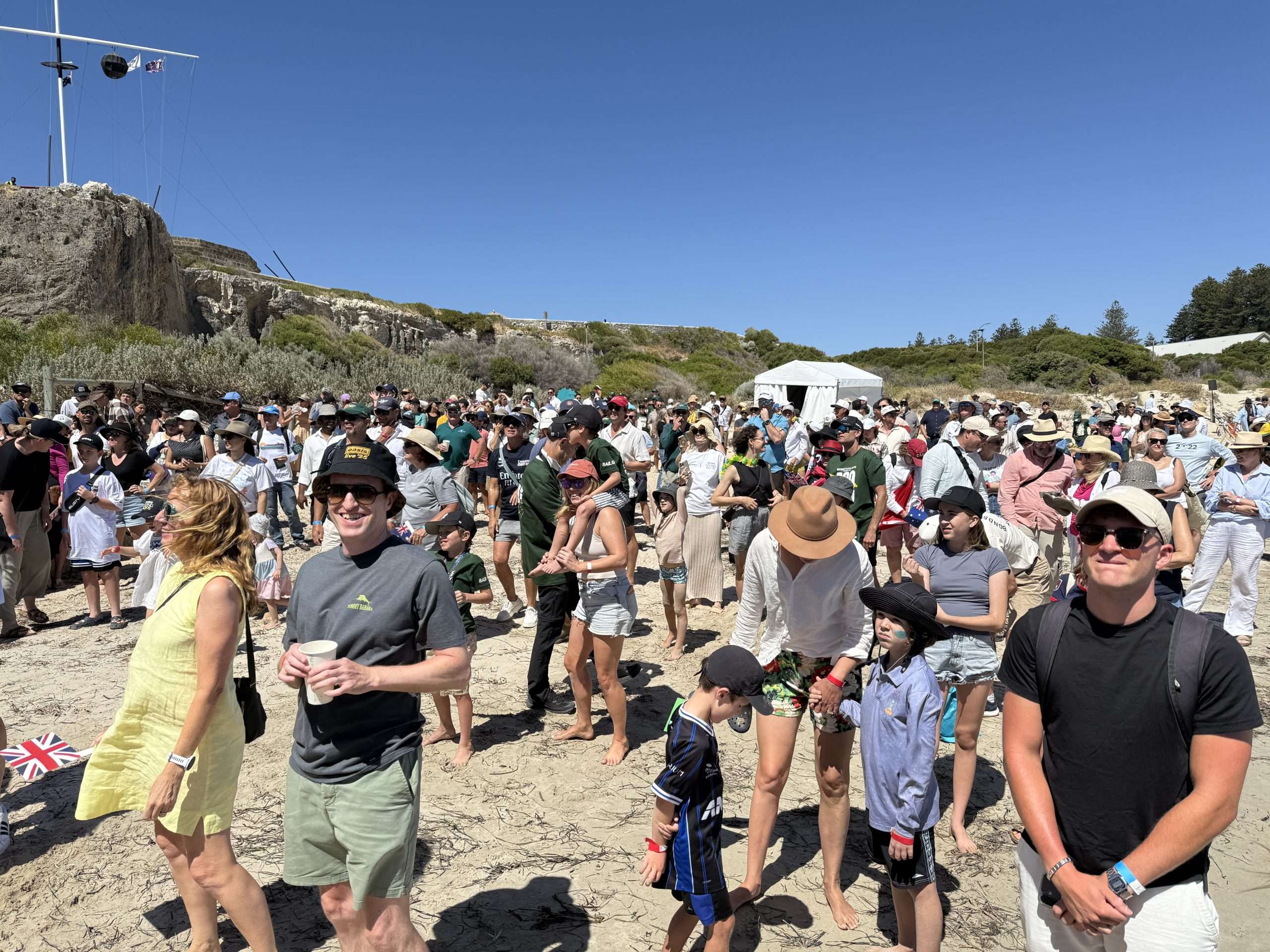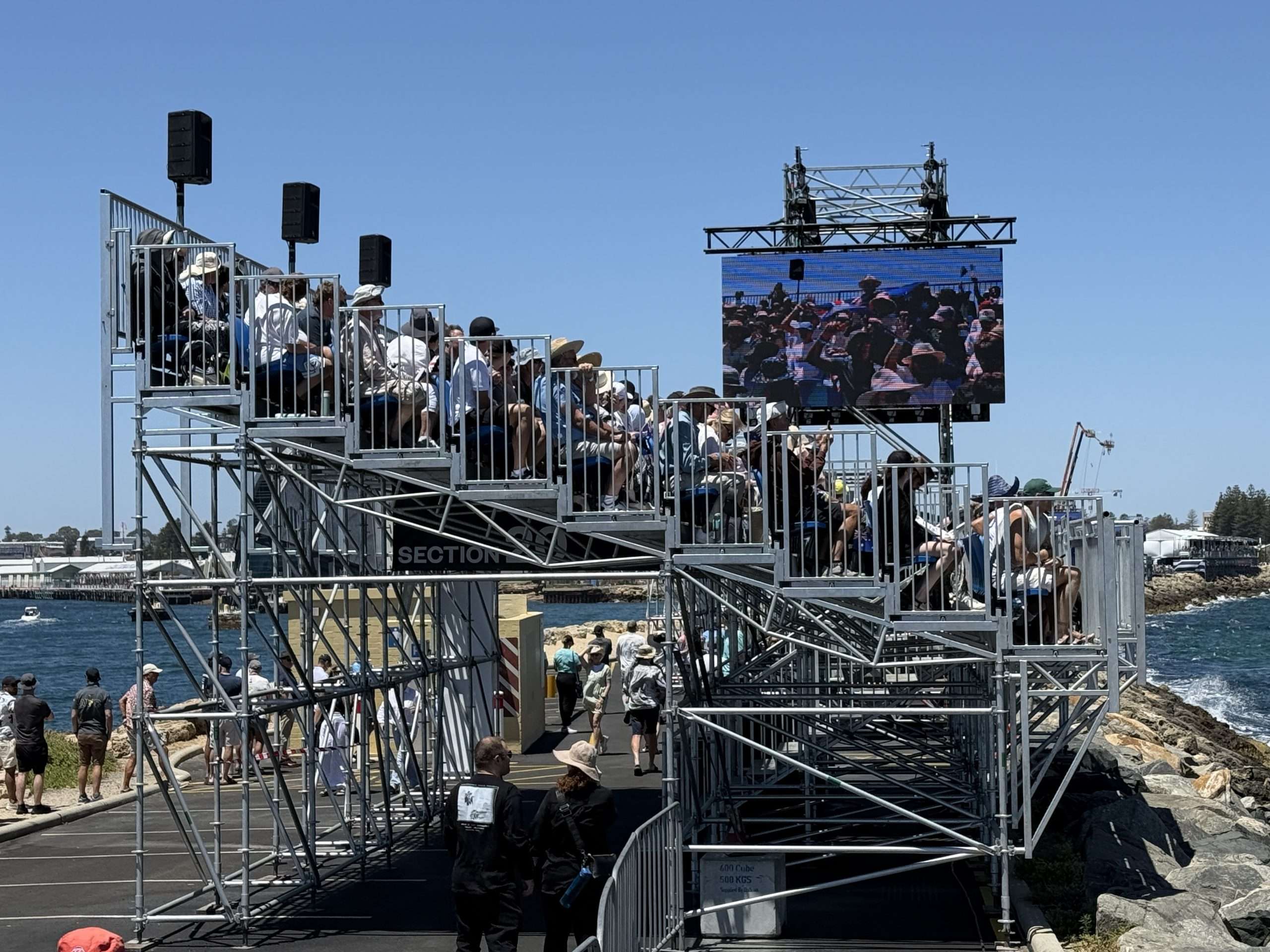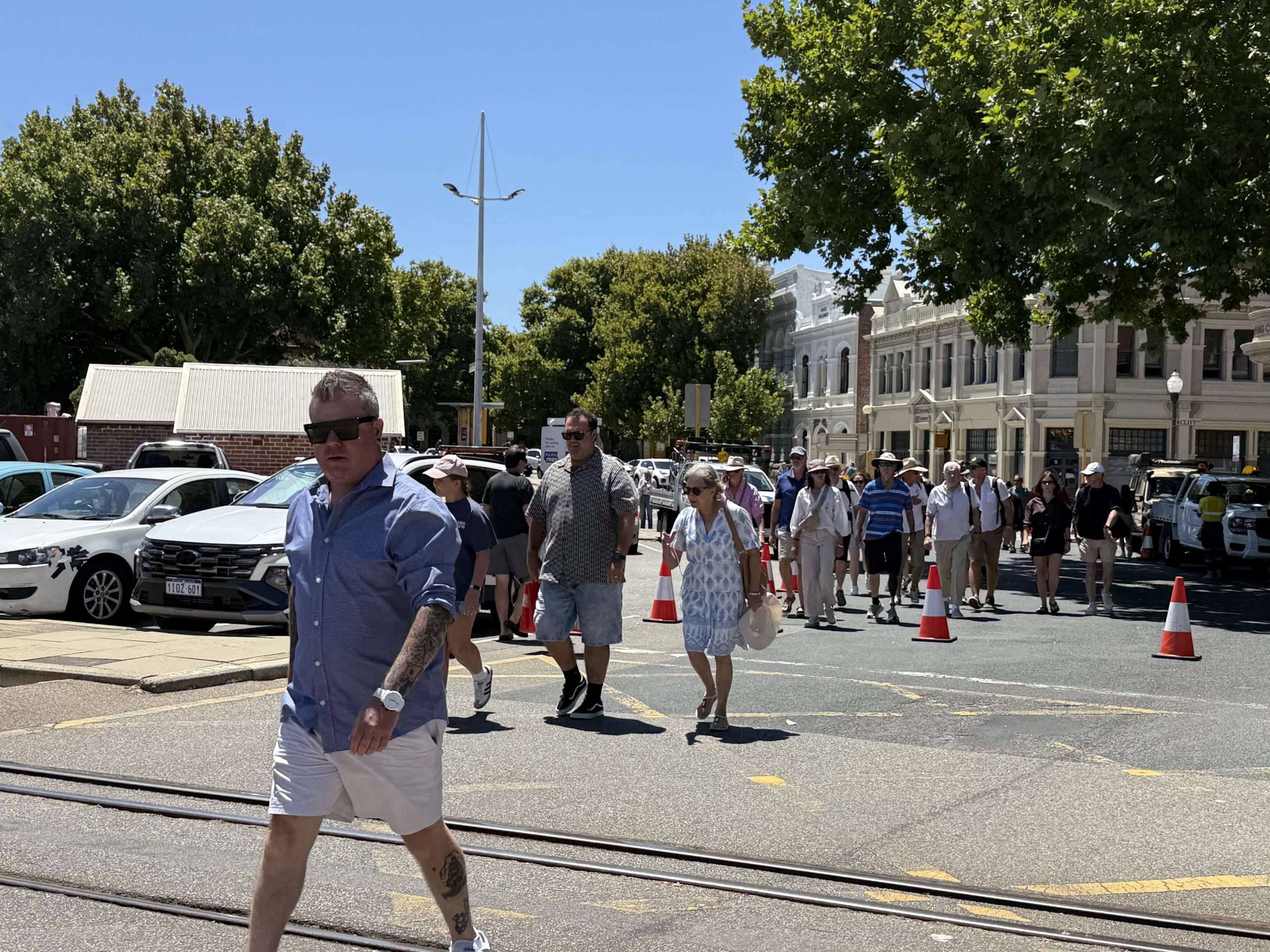 As yesterday, the spectators poured into Freo to find their way to the grandstands. Here are some shots our Jean Hudson snapped of the horde heading from the Freo Railway Station to Fleet Street and the big grandstand on South Mole, which holds nigh on 7,000 folk.