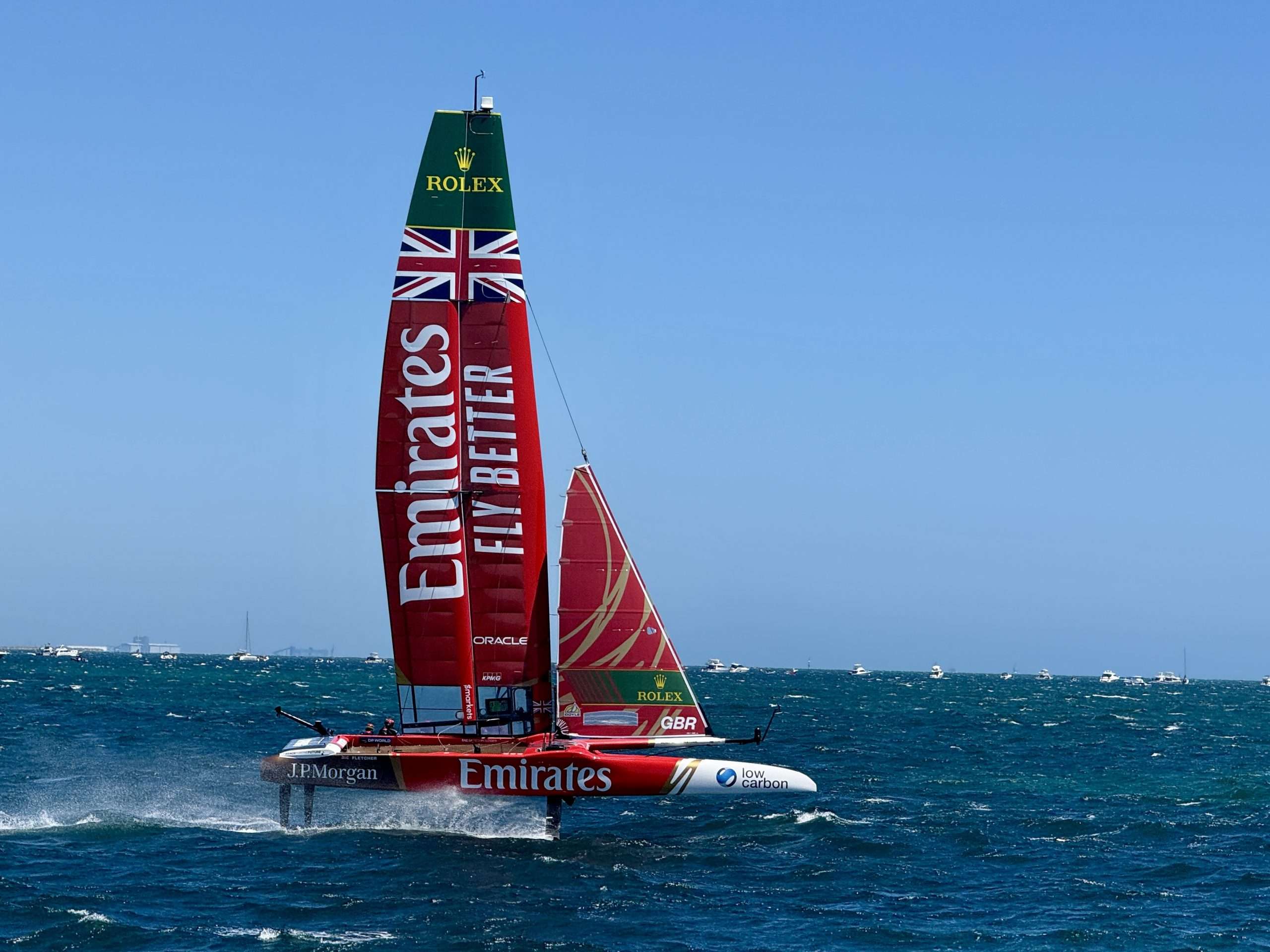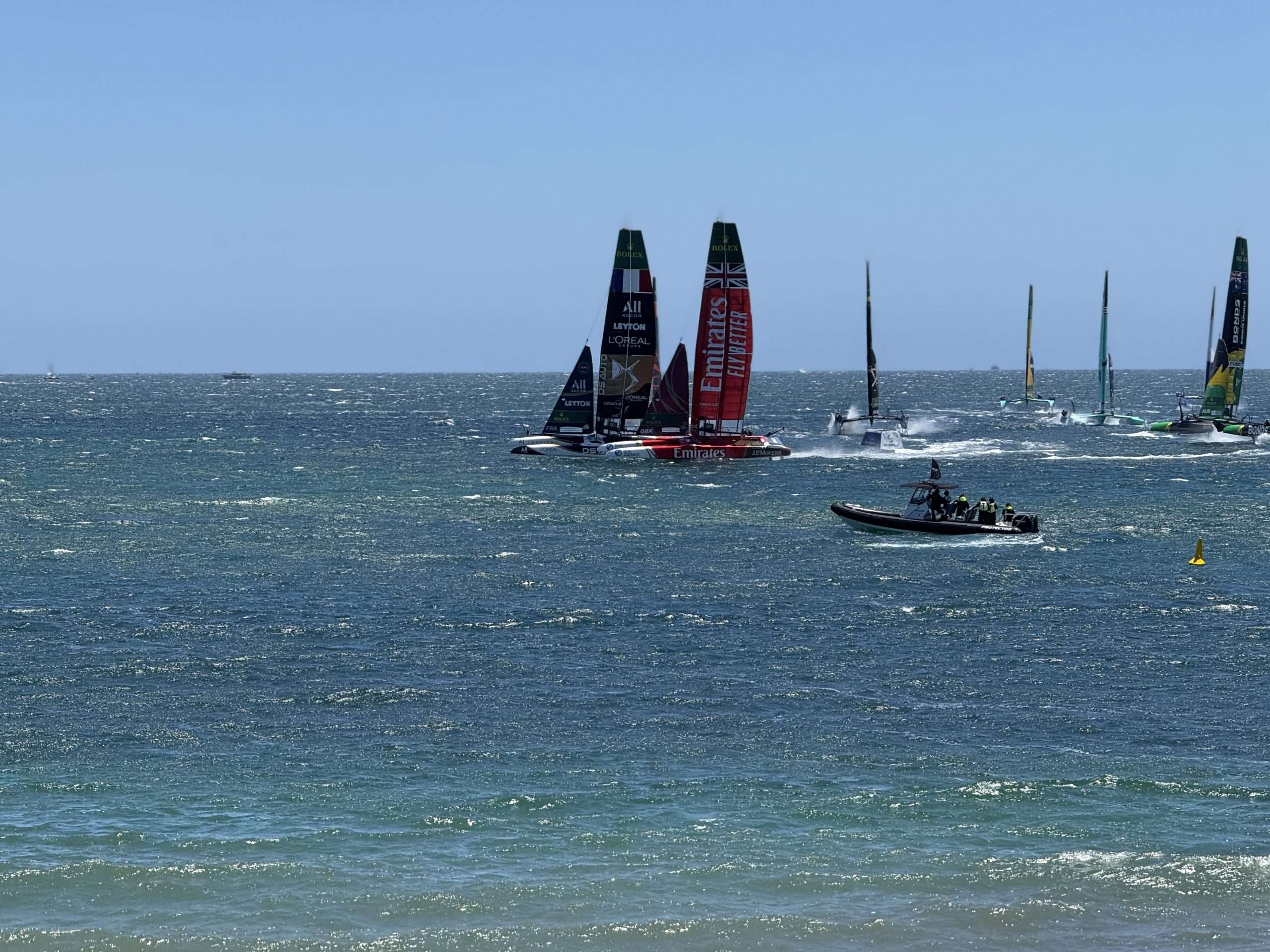 After a starting penalty put the Tom Slingsby skippered Flying Roos behind at the start, it was pretty much a one boat race for the next 15 minutes. Emirates GBR looked uncatchable, and they were.