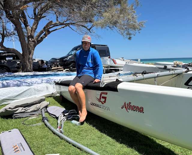 While visiting the Sailing Club today, we caught up with Anthony, from Tasmania, with his F18, ‘Athena’. He’s ready to compete in both events. He and his father brought their F18s over the Nullabor to be in the West for this not-to-be-missed event.