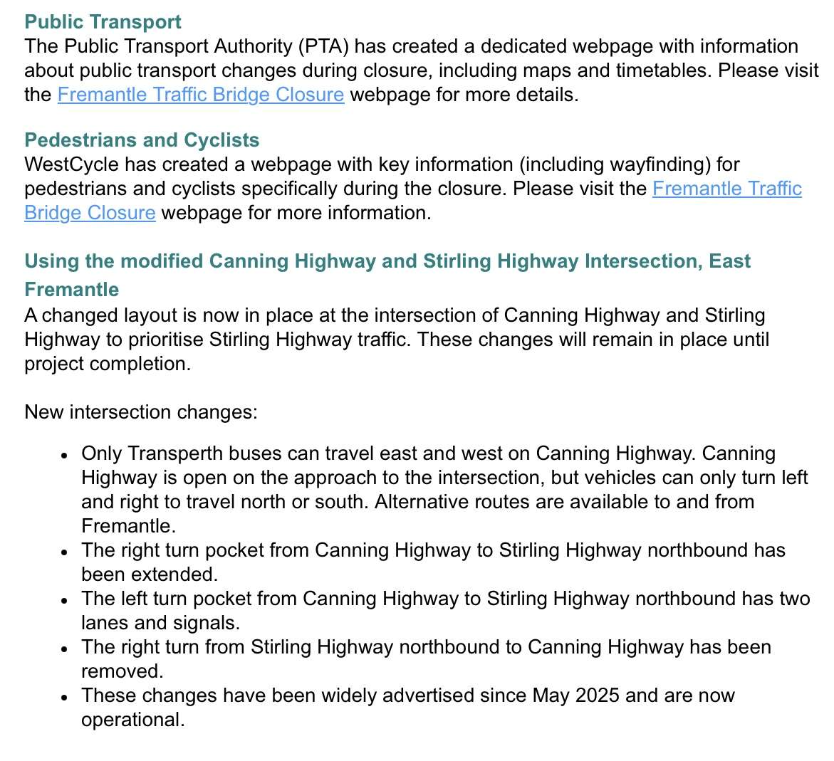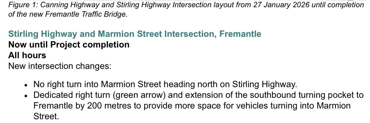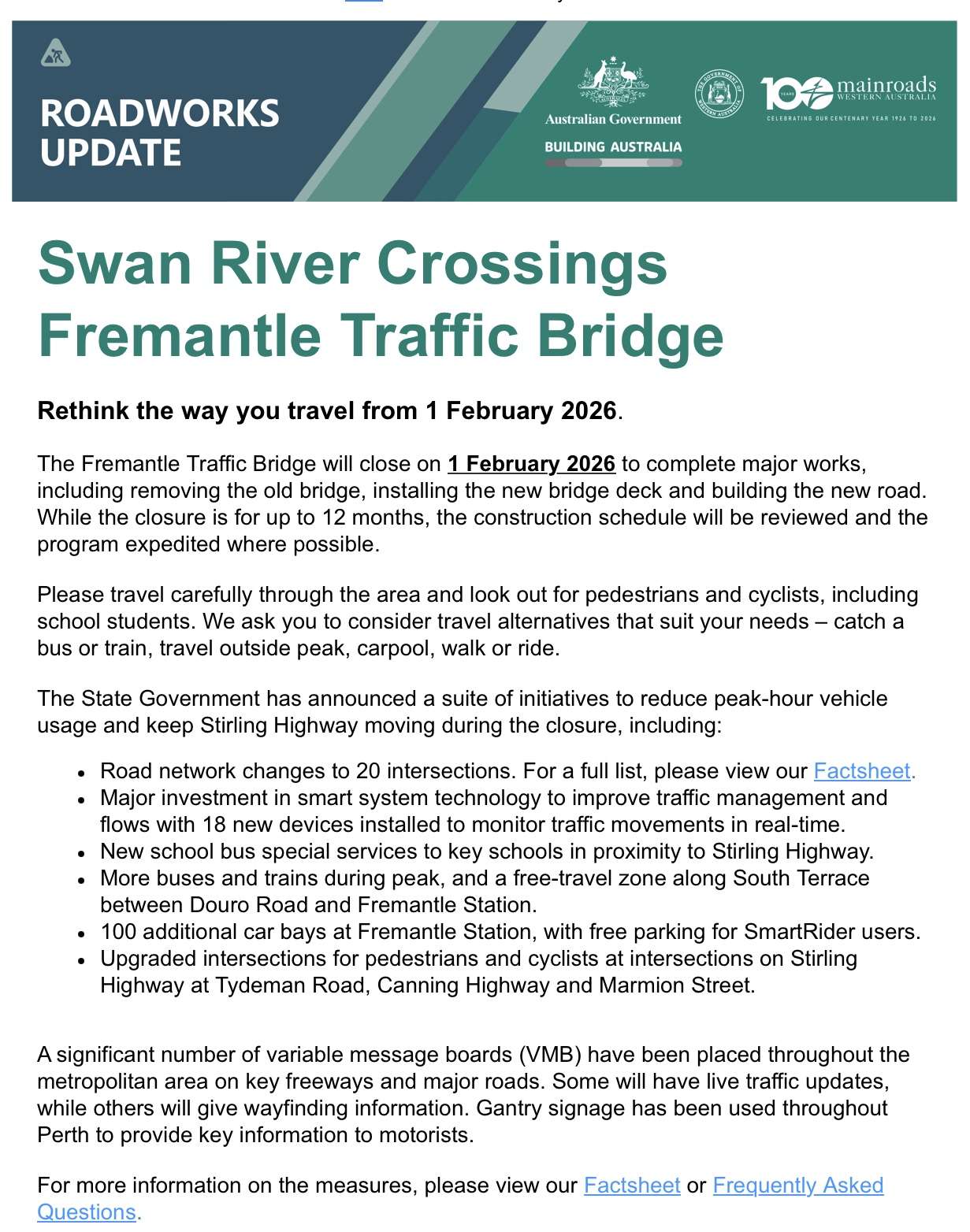 Here’s Main Roads WA’s last post before the Sunday, 1 February 2026, OFTB/NFTB closure.