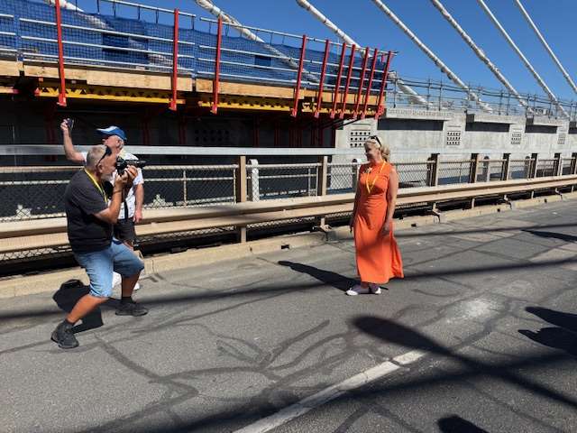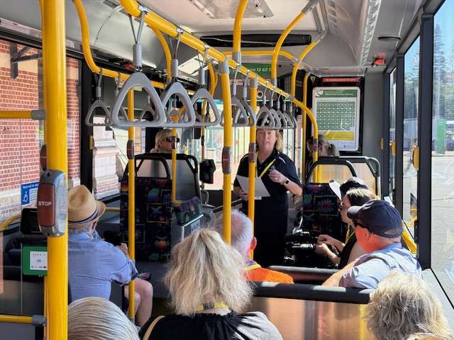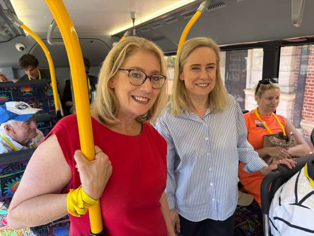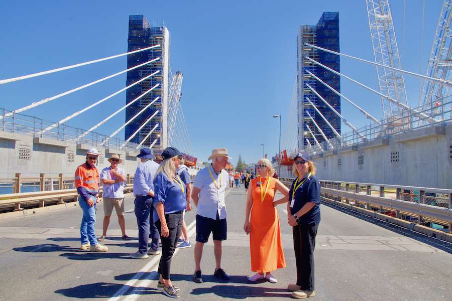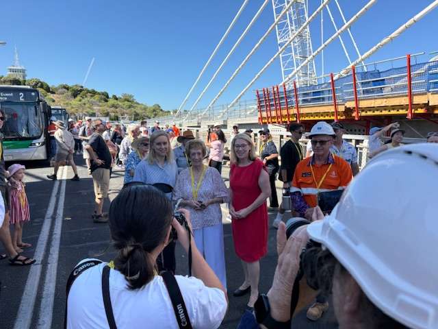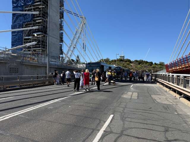 At Fremantle Railway Station a dot or two after 9.15 am this morning, an assorted assembly of Old Fremantle Traffic Bridge well-wishers and Old Bridge tragics, as well as replacement bridge admirers, led by a beaming Deputy Premier Rita Saffioti, who is also the State’s Treasurer, Minister for Transport and Minister for Sport and Recreation, and happy as Fremantle MLA Simone McGurk, boarded three Bridge bound buses.