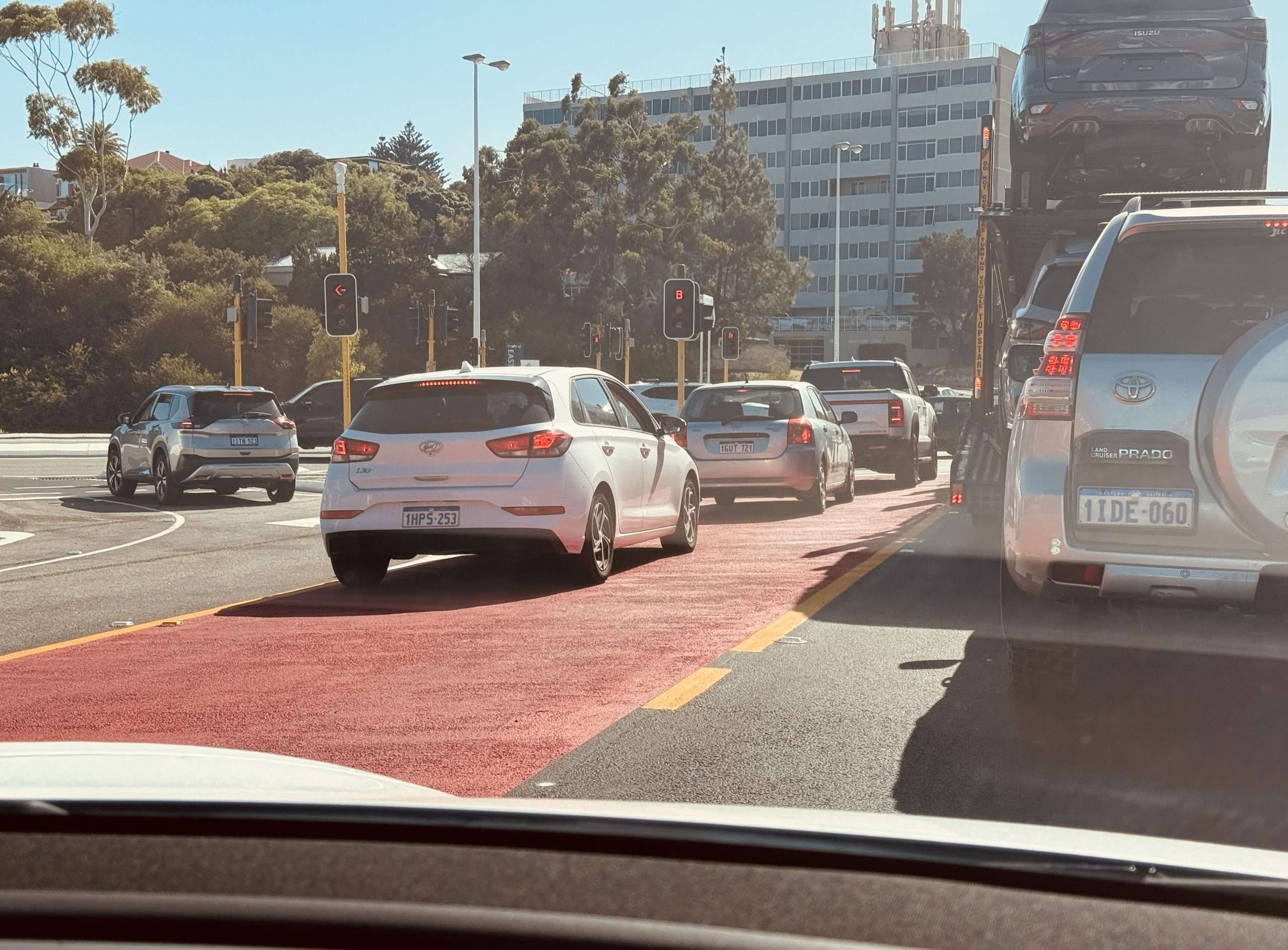 Well, as we reported yesterday, on Day 1 there seemed to be confusion amongst drivers about what to do when they found themselves in the Bus Only lane travelling east on Canning Highway and coming onto the red paved road surface with only the the B traffic lights at Stirling Highway ahead of them.