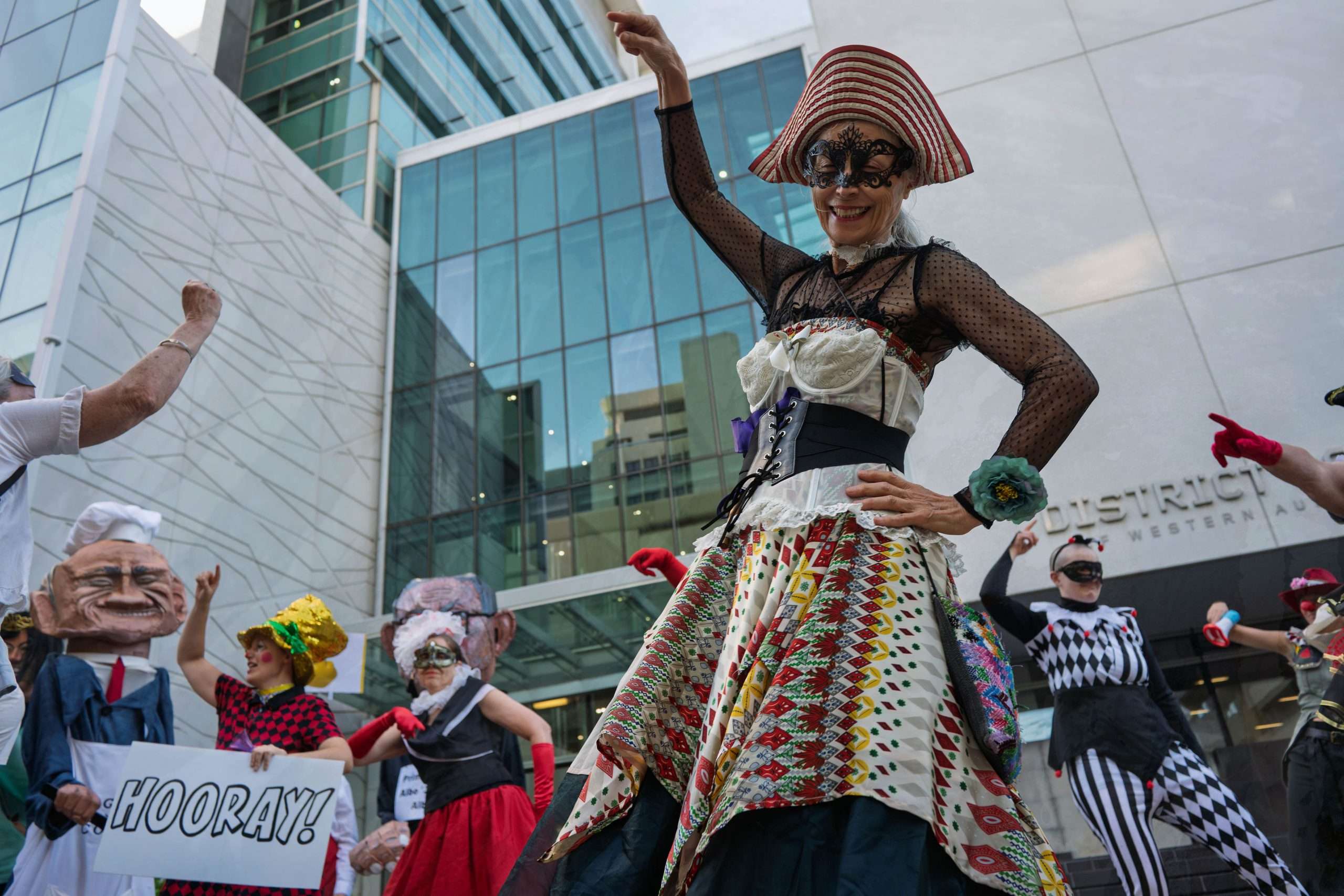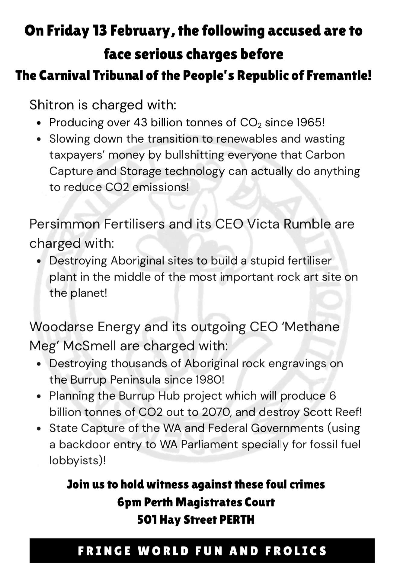 Last Friday, 13 February 2026, as part of Perth FRINGE WORLD Festival, Fremantle Carnevale, in the tradition of all famous Carnevali everywhere, took feral folk on a merry dance, actually a Fossil Fool Crime Walk through the streets of Perth, starting out from Perth Magistrates Court in Hay Street at 6 pm.