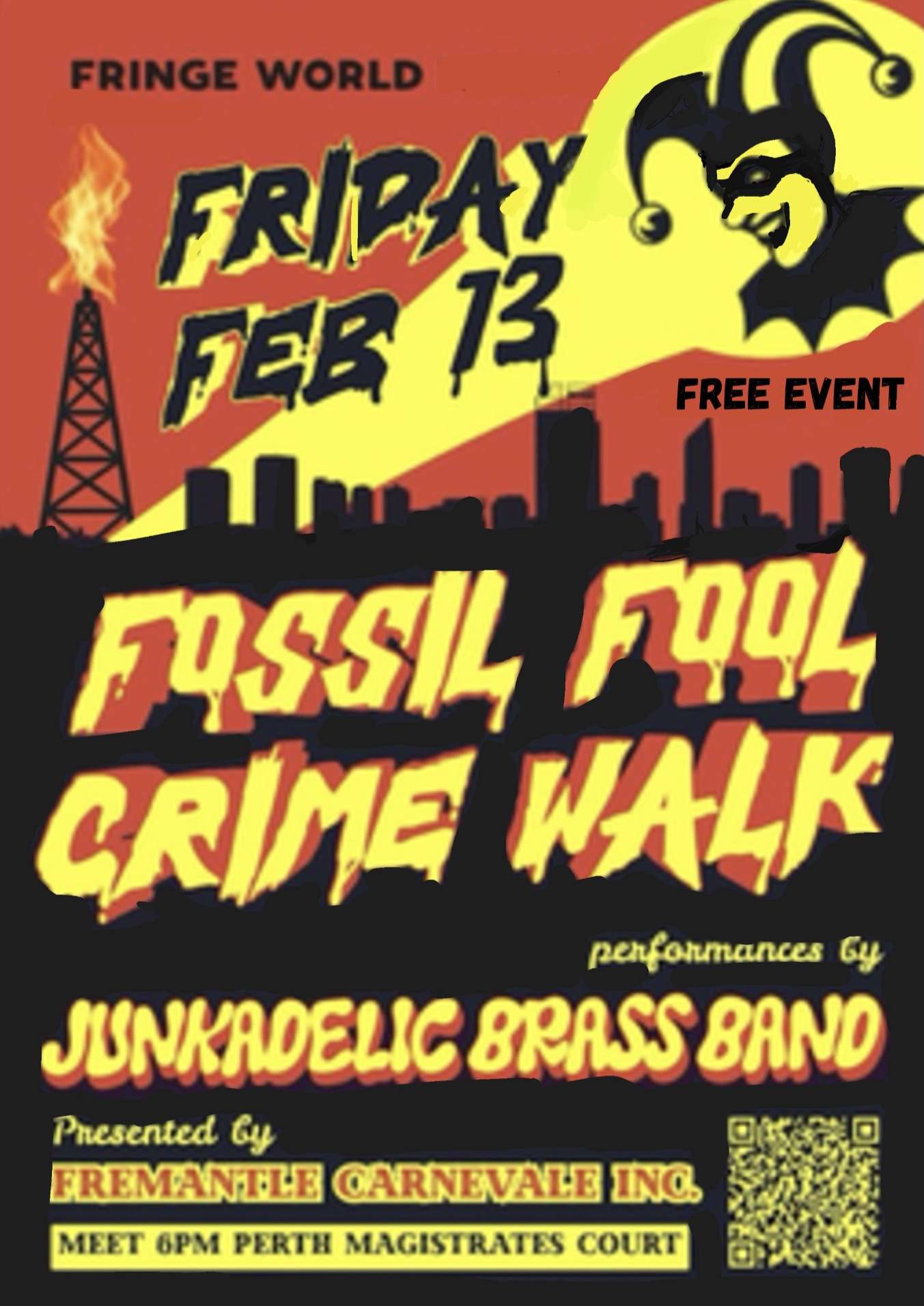 And that Fremantle Carnevale’s Fossil Fool Crime Walk would ‘feature a CSI team, roving clowns and harlequins, a range of (extremely well-known) expert witnesses, and a live Carnival soundtrack pumped out by Junkadelic Brass Band.’