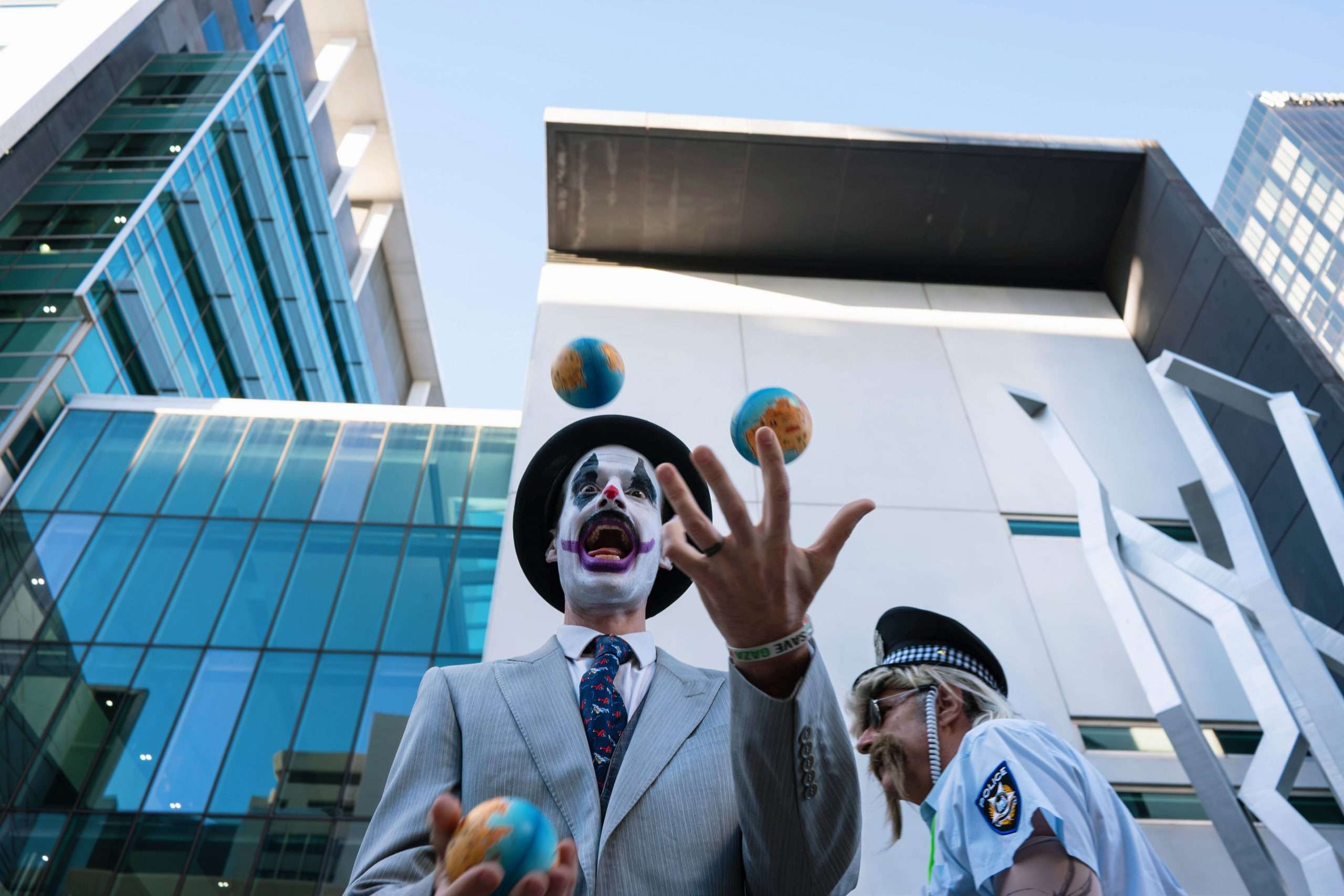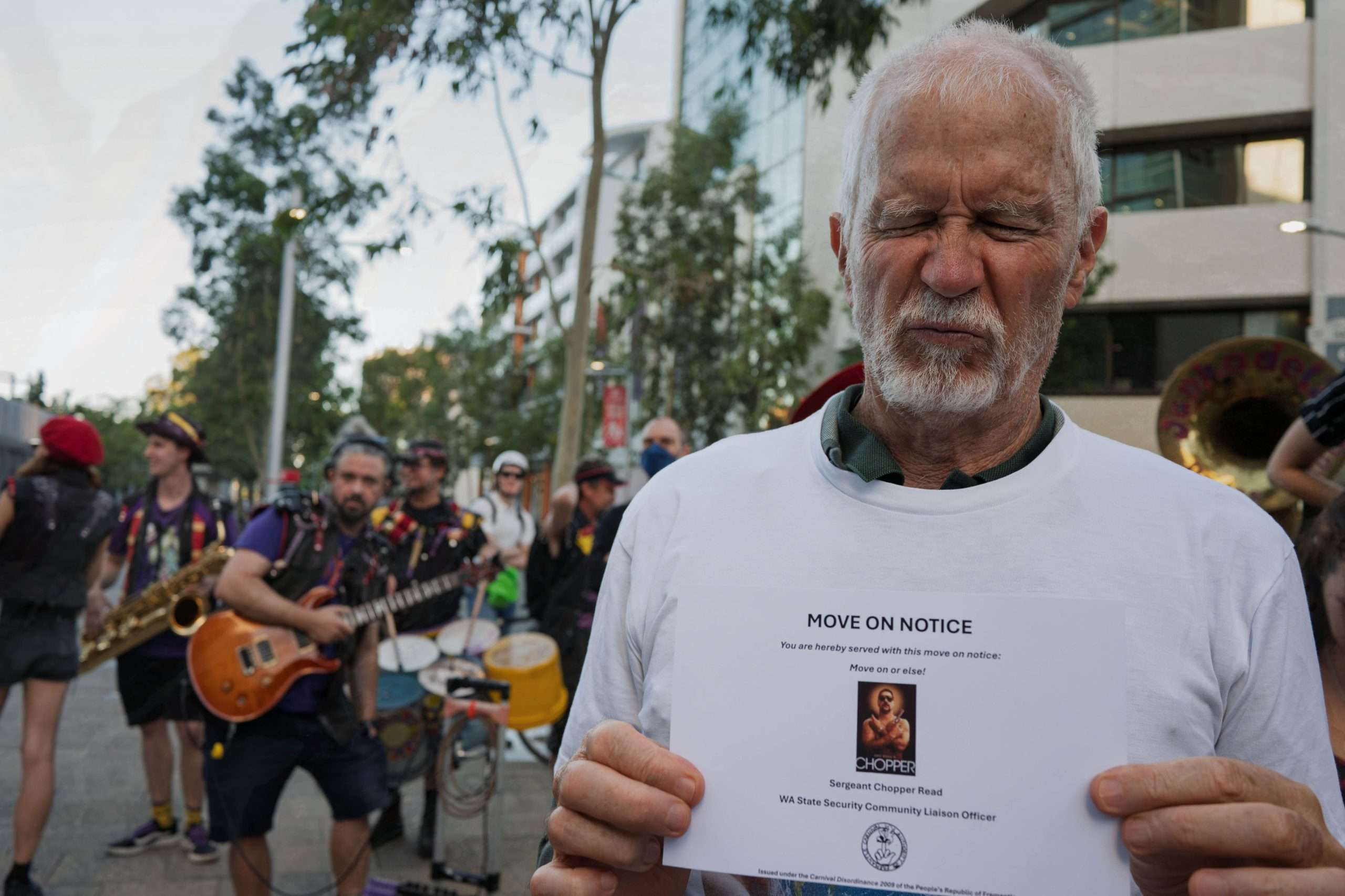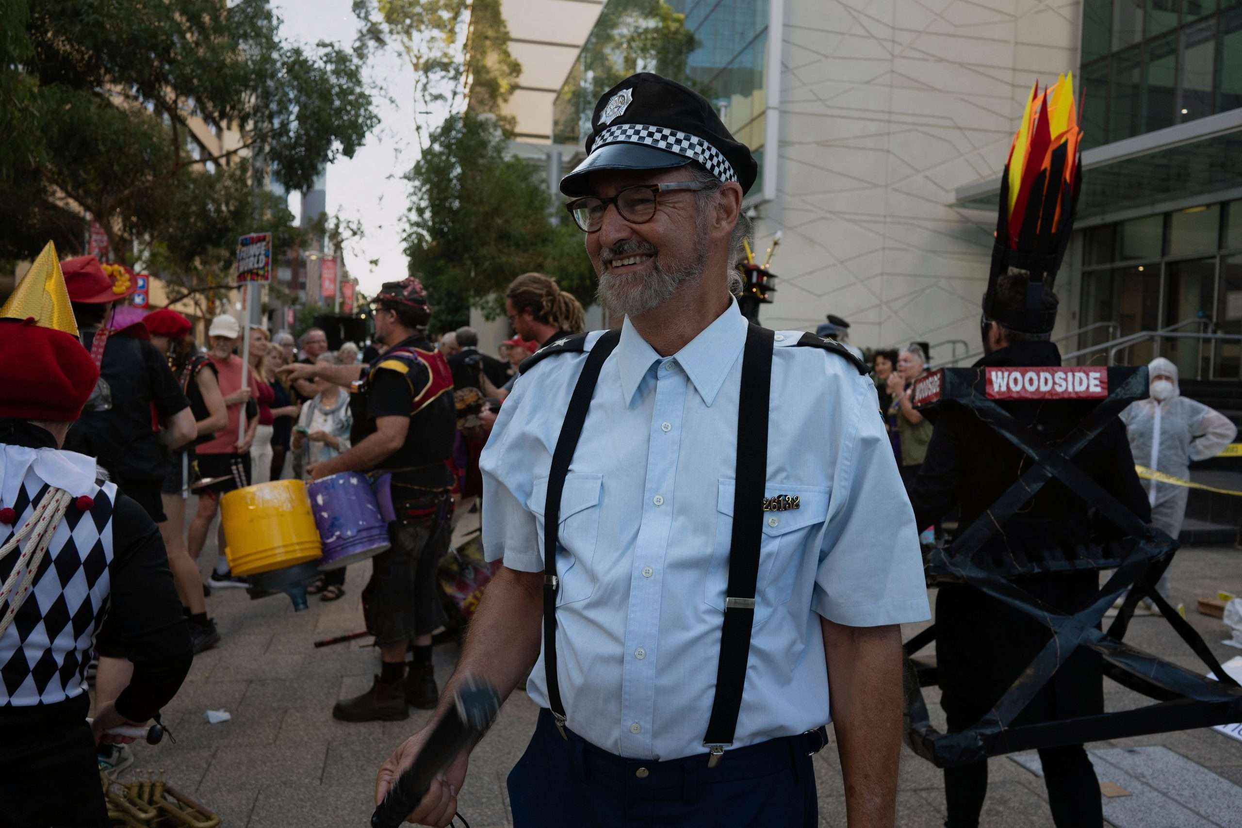 Dodgy added that with assistance from Junkadelic Brass Band, a harlequin flash mob and a posse of fossil fool clowns, MC Paddy Stokes (the well known WA media entrepreneur) kept the crowd amused with a witty commentary in rhyming couplets.