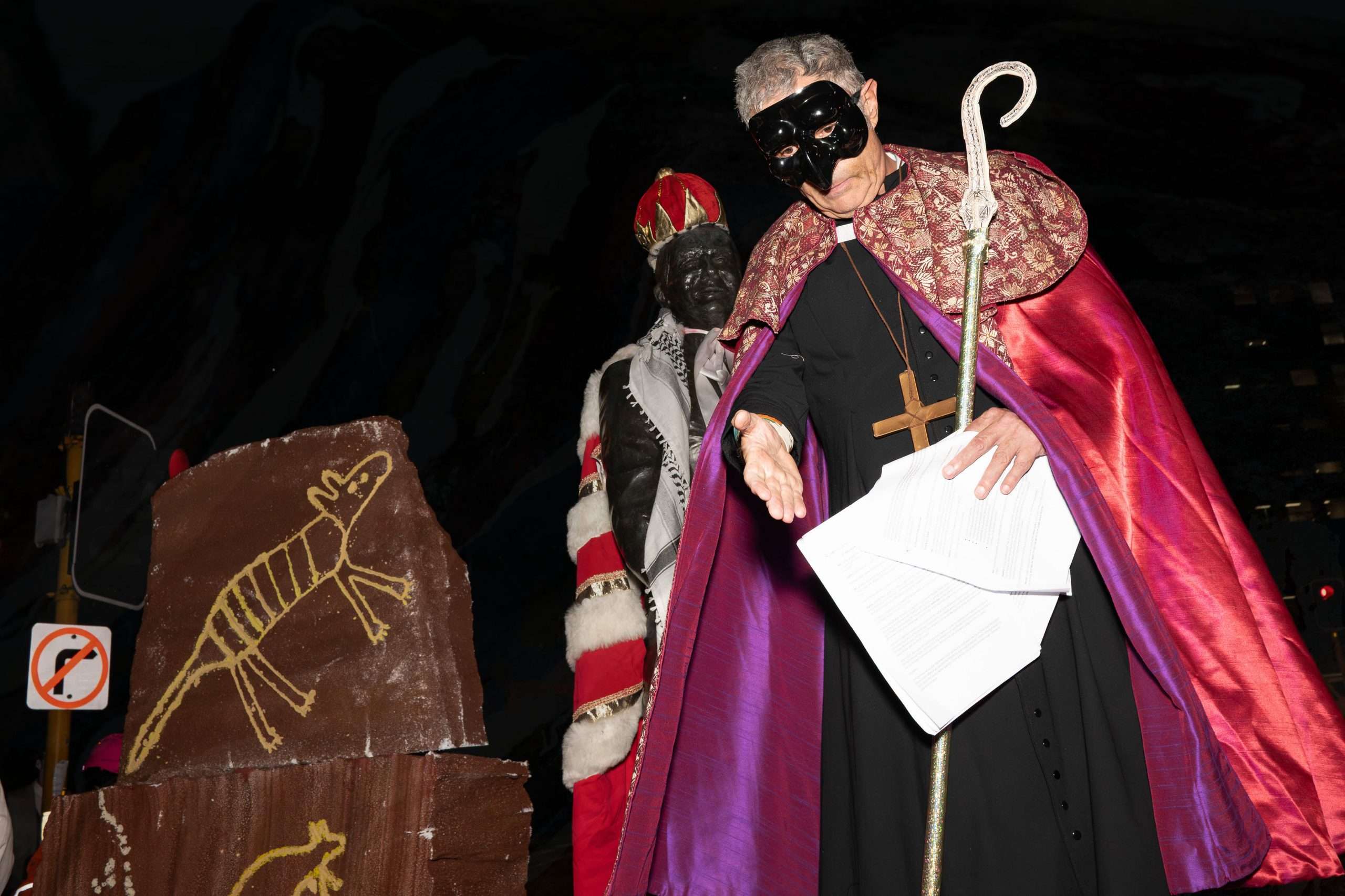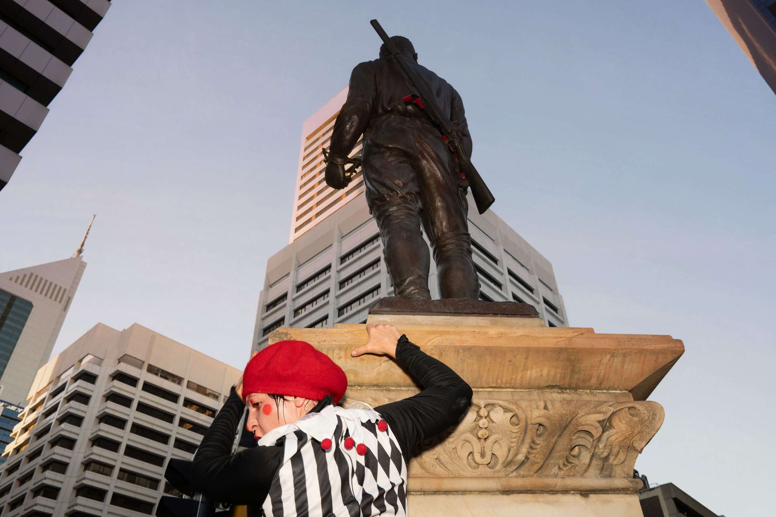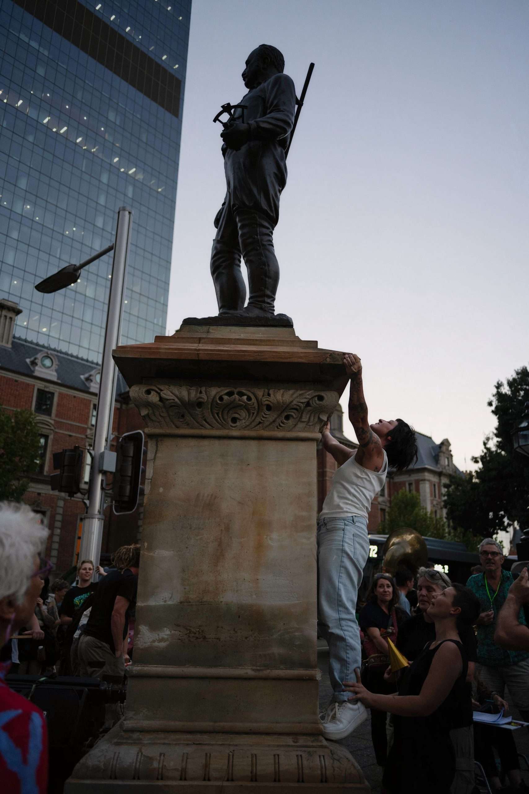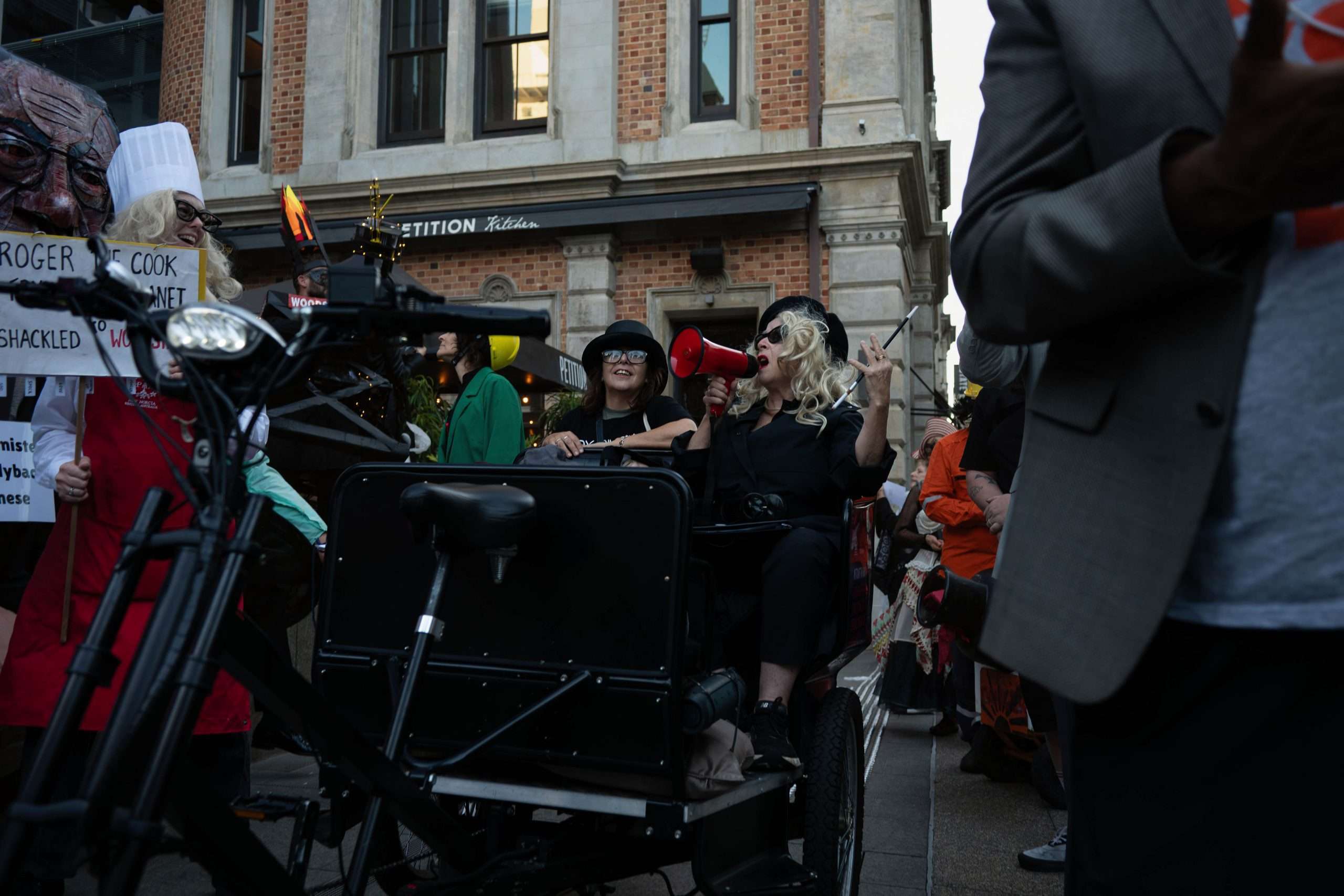 Fossil Fool Crime Walkers were guided by French New Wave Director Jeanne-Luc Badarse who directed the FOSSIL FOOL CRIME WALK with her red megaphone from a rickshaw (following the unfortunate injury caused by excessively high-spirited Carnival dancing the week before). Participants halted briefly at the Alexander Forrest statue on the corner of Barrack Street and St George’s Terrace to hear Greens MLC Sophie McNeill’s diatribe against this founding father of Western Australia who used to advocate in State Parliament for state terrorism measures against First Nations peoples in the Kimberley in order to protect his family’s cattle interests (as well as passionately opposing women’s suffrage).
