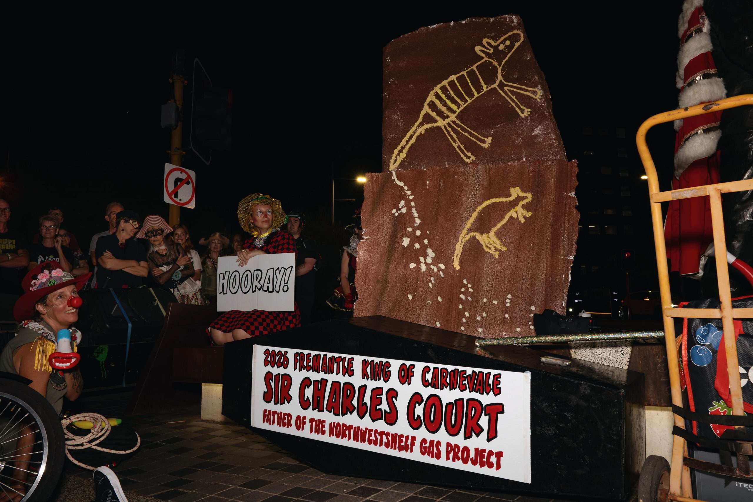 Dodgy told us that the mystery 2026 Fremantle King of Carnevale was announced by the Carnival Herald outside Woodarse Energy to be … 🥁…Sir Charles Court, ‘founding farter’ of the Northwest Shelf LNG project. In accordance with ancient Carnivale tradition, the King of Carnivale expired half way through proceedings.