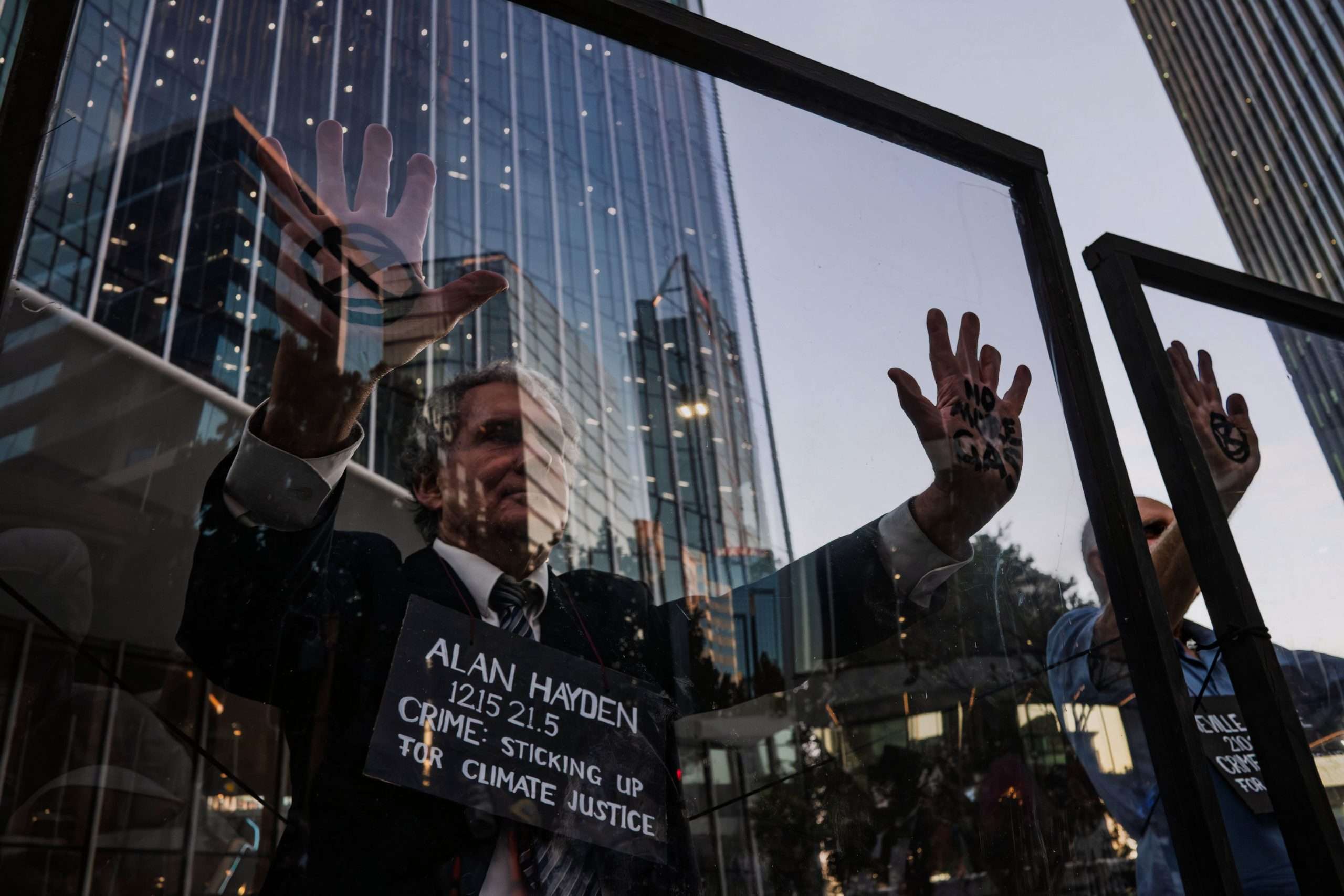 [POURS LIQUID FROM A CANISTER LABELLED ‘WOODSIDE ACID GAS EMISSIONS’ OVER STATUE AND COVERs IT WITH A BLANKET.