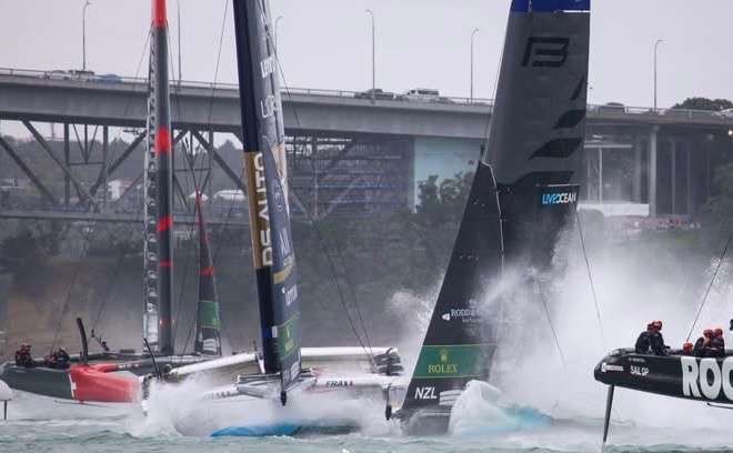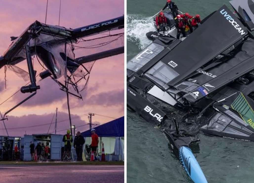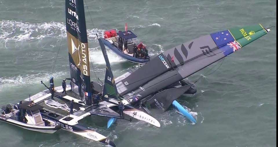 Both boats sustained significant damage, and the racing was abandoned for the remainer of the day. A million-dollar repair operation has begun with a plan to salvage one boat from the two-boat wreckage. That means that New Zealand and France will not compete in next weekend’s Sydney Grand Prix.