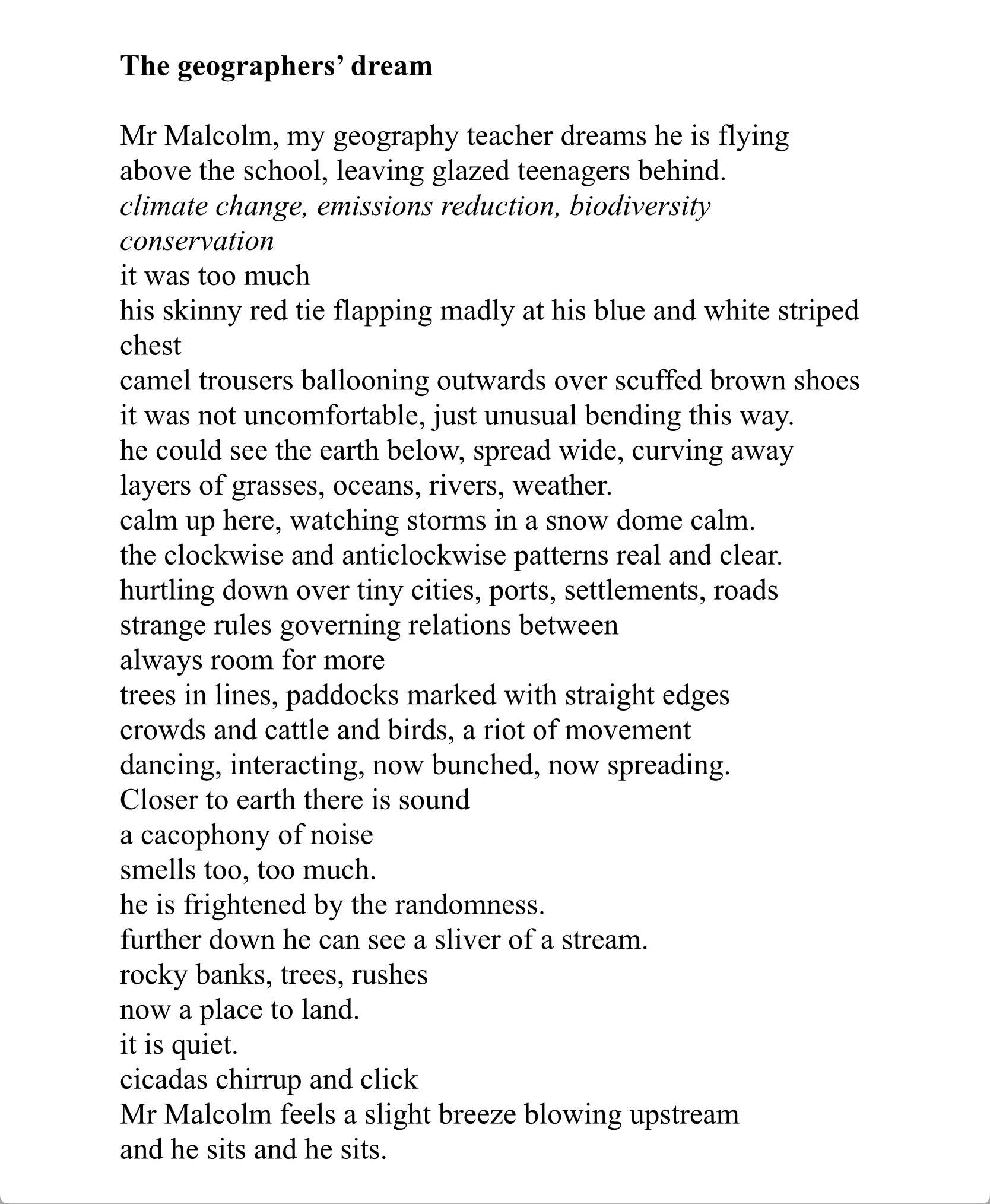 Kathleen Broderick is a geographer and occasional poet who lives and works in Walyalup, Fremantle. Her poetry heroes are many and include her writing colleagues at OOTA (Fremantle Arts Centre). She is interested in stories and poems about landscapes, human agency and impact.