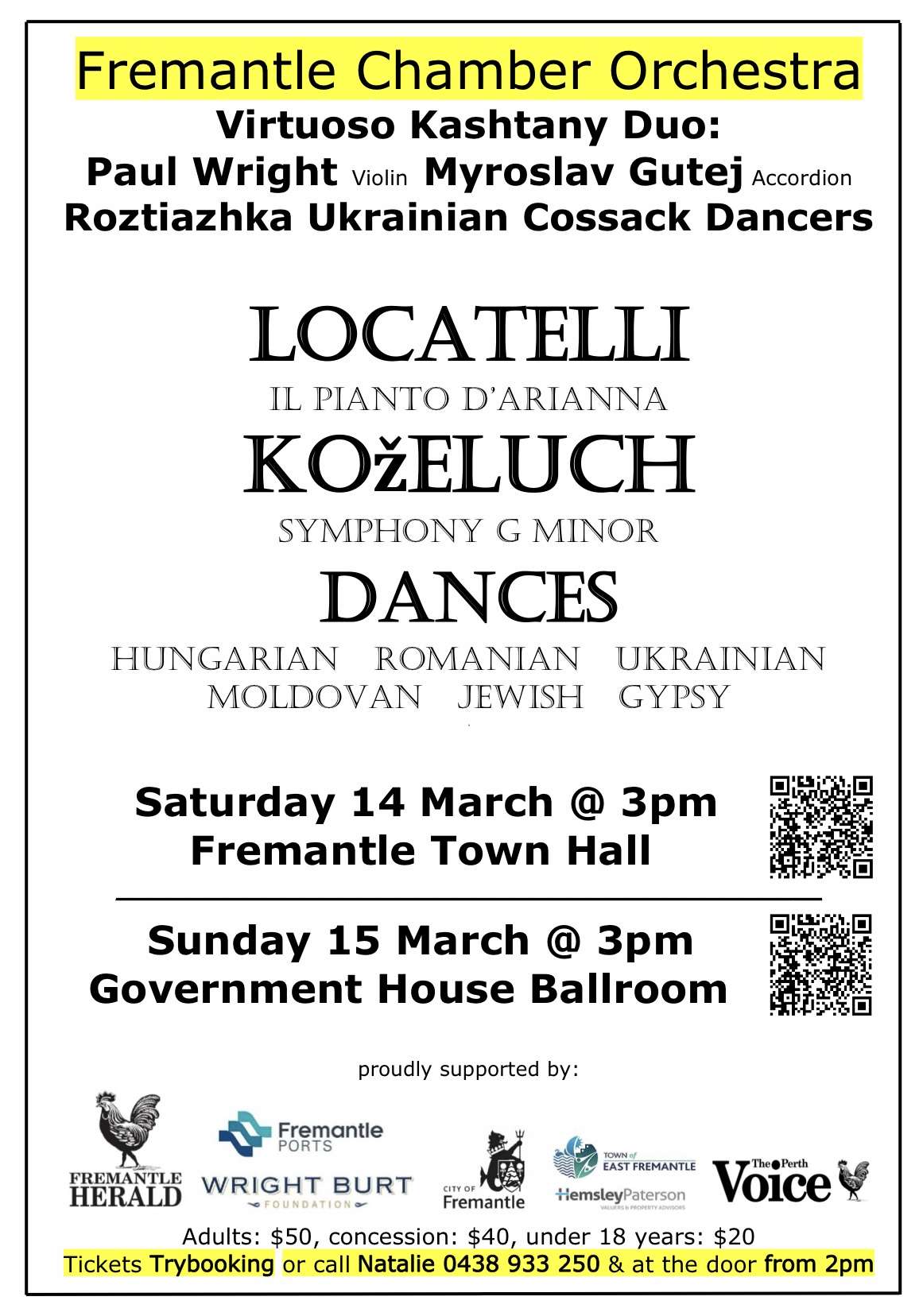 Don’t miss a sobbing solo violin when Fremantle Chamber Orchestra, Kashtany Duo & Ukrainian Roztiazhka Cossack Dancers perform in Freo on Saturday, 14 March 2026 at 3 pm and in Perth the next day