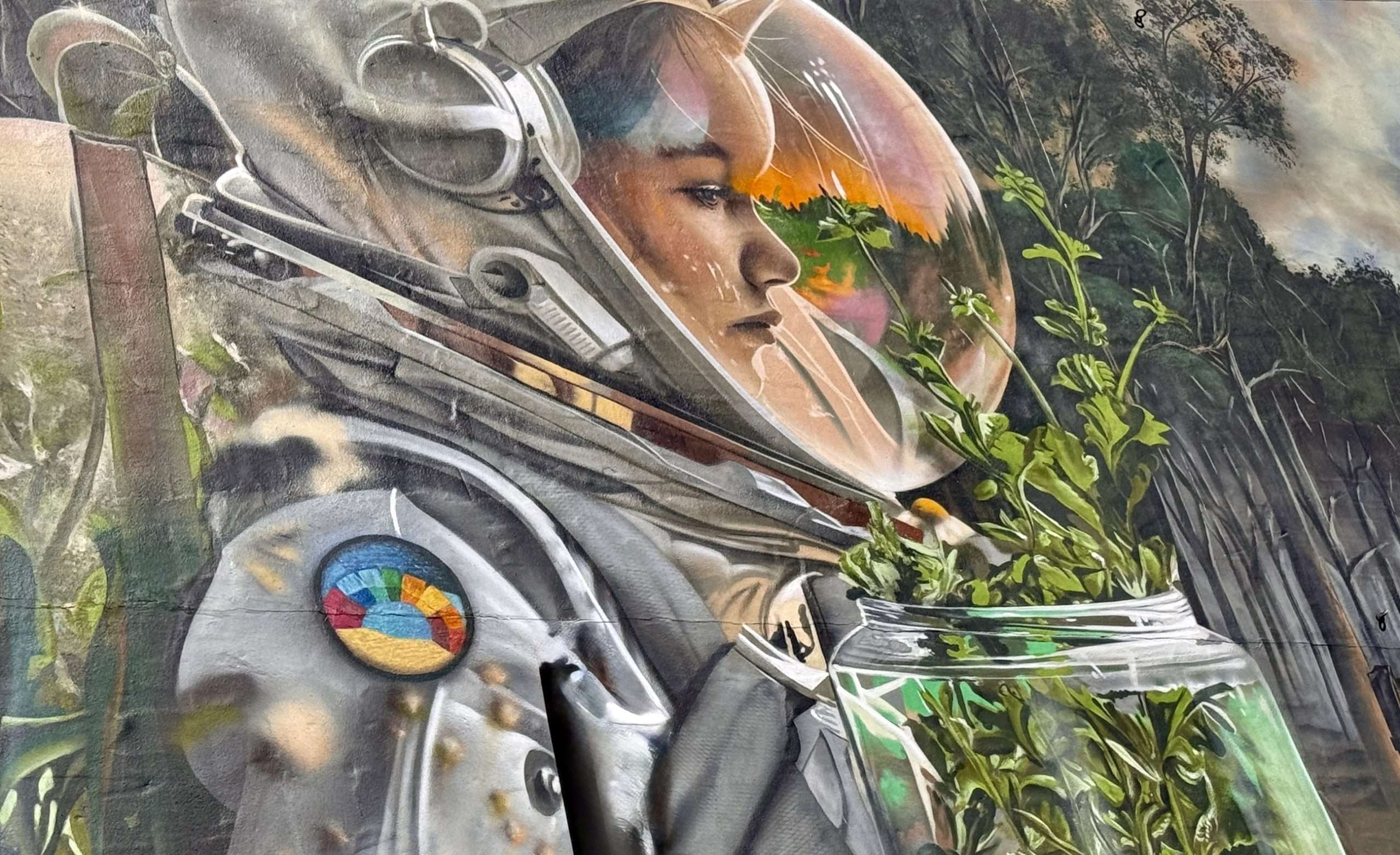 It sends a message about caring for the environment during our time on earth and preserving native plants and animals. It’s a beautiful, detailed work with a girl living in an oxygen bubble saving plants.