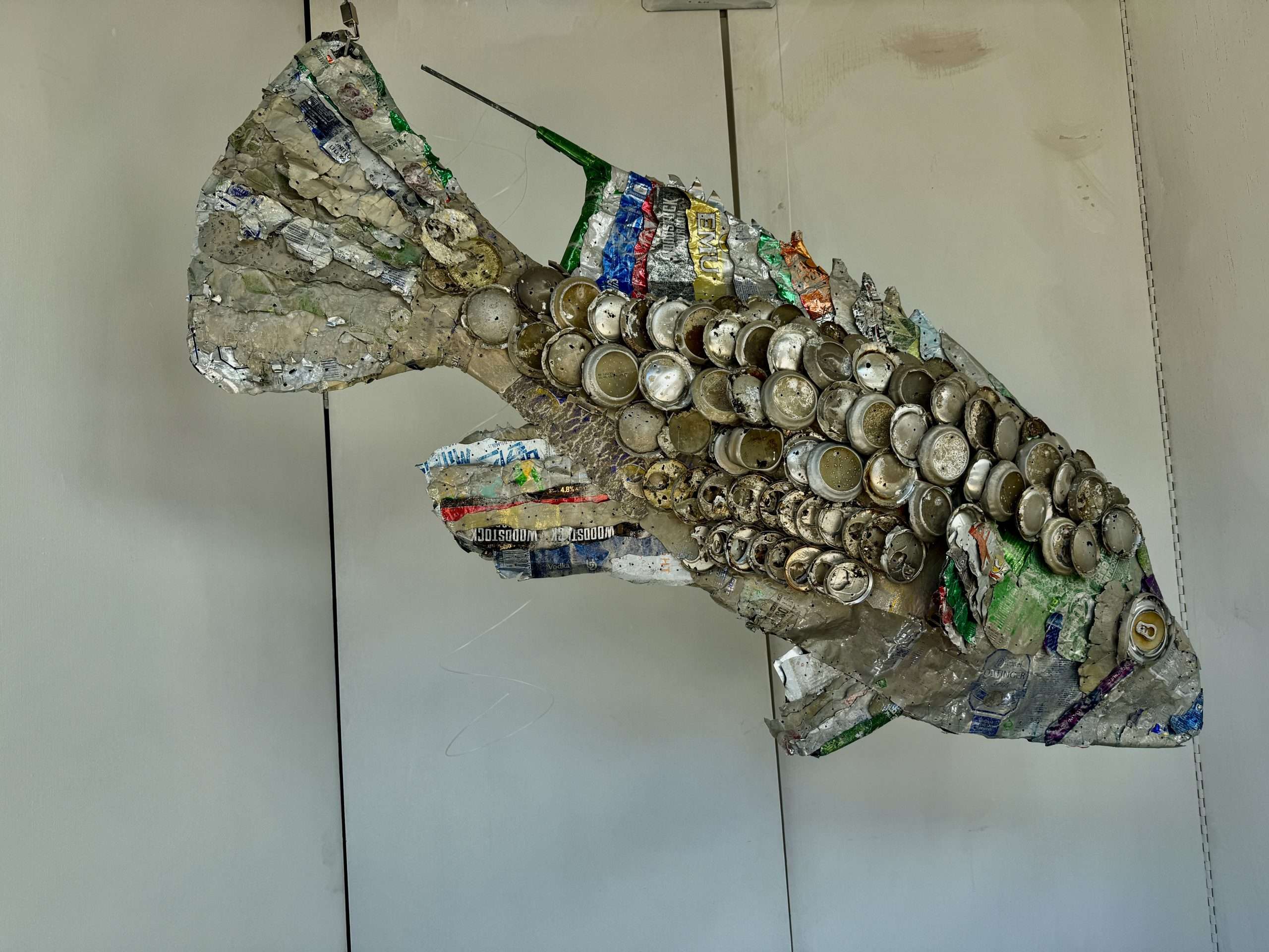 And just beneath this mural, you’ll find another piece of art, inside a glass panel – Dhufish, by local artist Neil Kidd. Neil collects rubbish on Bathers Beach most mornings, and uses some of it for his art. Dhufish is made from bits of aluminum cans. Love it!