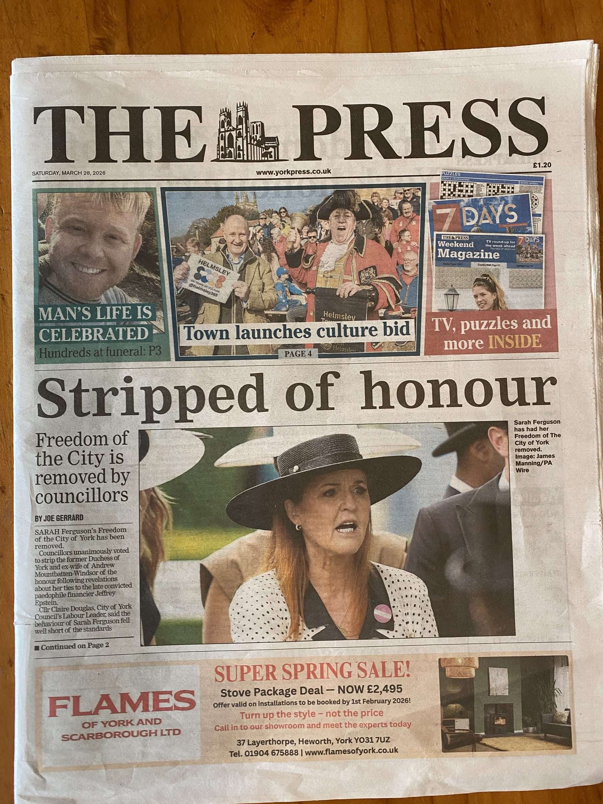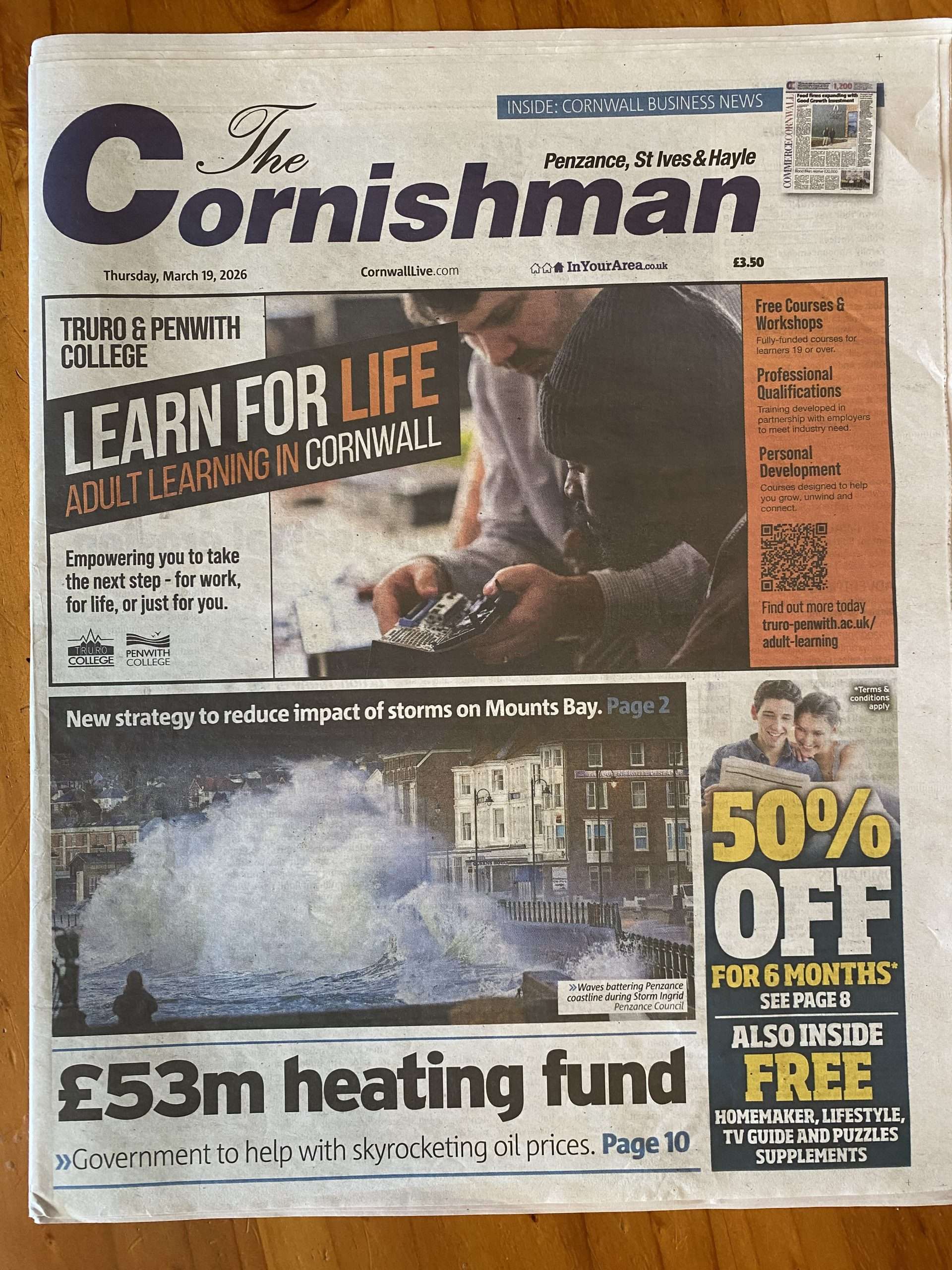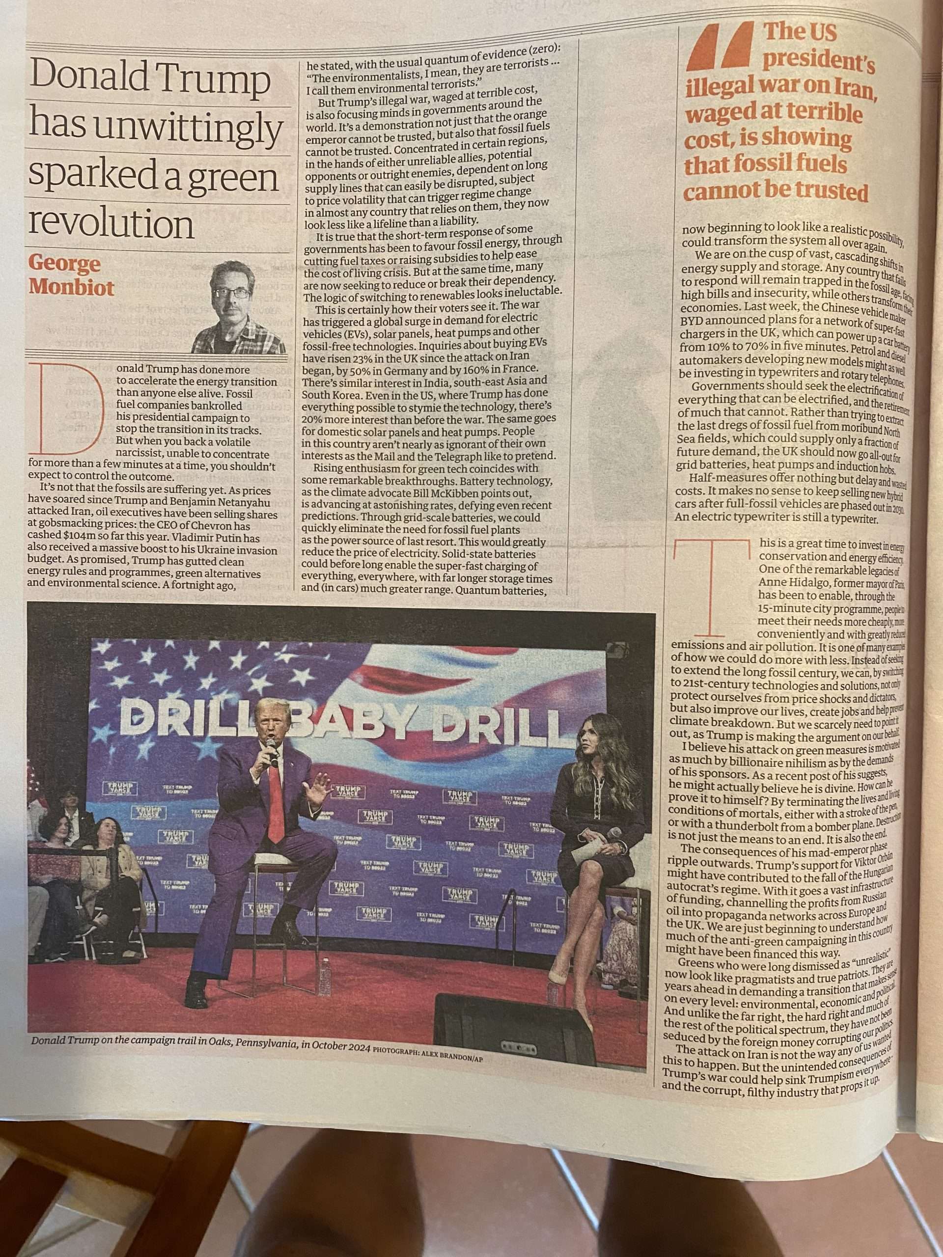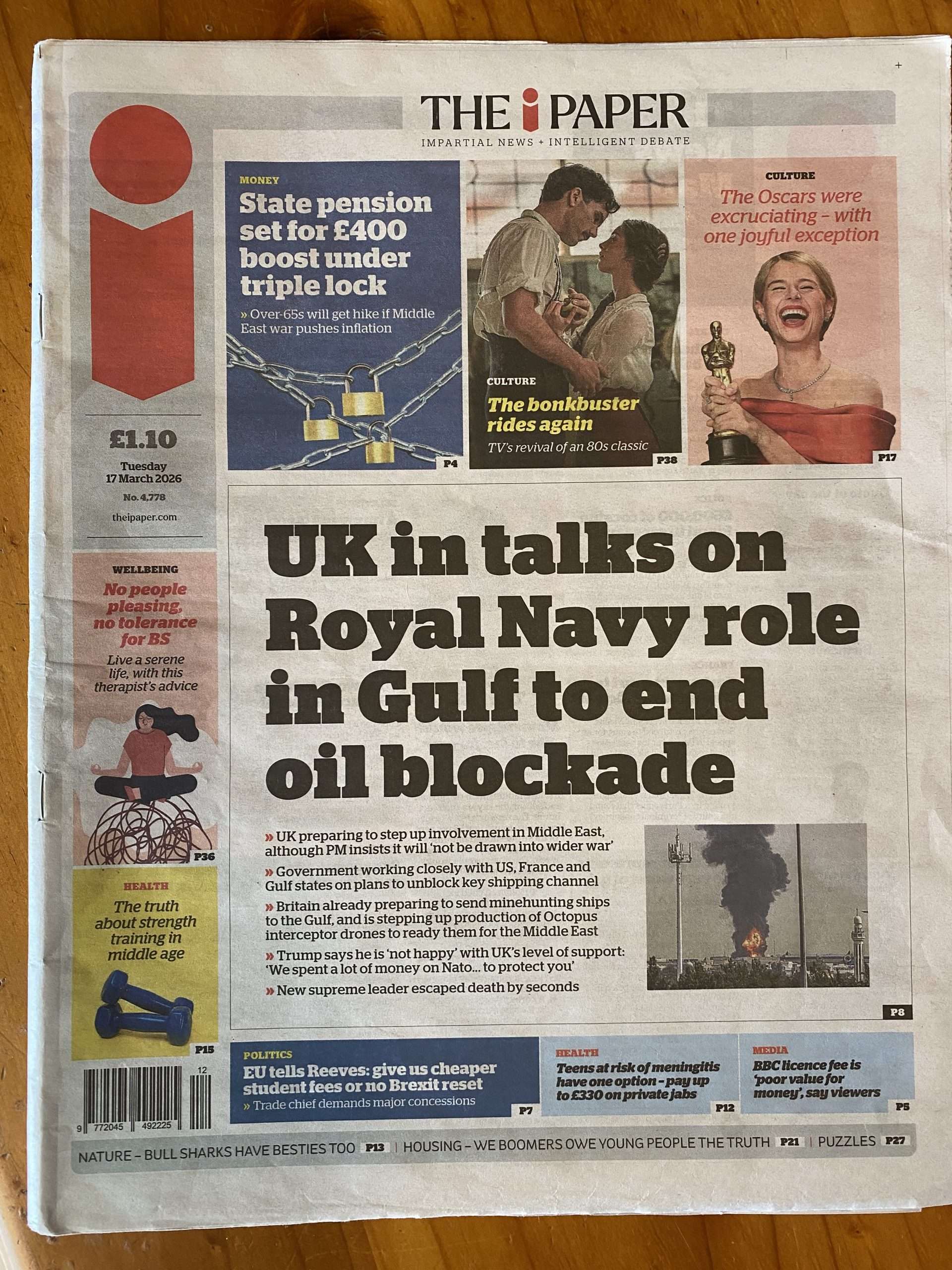 One of the joys of reading newspapers is not knowing what you are going to read about as you turn the next page, no algorithms to direct your gaze. I love the serendipity of it all. Of course the major stories covered while I was in the UK were the Iran War – we were lucky to get to the UK in the first place by flying via Kuala Lumpur on Malaysia airlines and there was always the thought in the back of my mind that we might get stuck there with all the uncertainty about the war and jet fuel shortages – and UK politics centred on Sir Kier Starmer’s government, renewable energy – particularly the growing conflict over the rapid spread of solar farms between farmers and local communities against the government – debates about expanding North Sea oil and gas exploration and production, fuel shortage concerns and the surprisingly poor state of the Royal Navy.