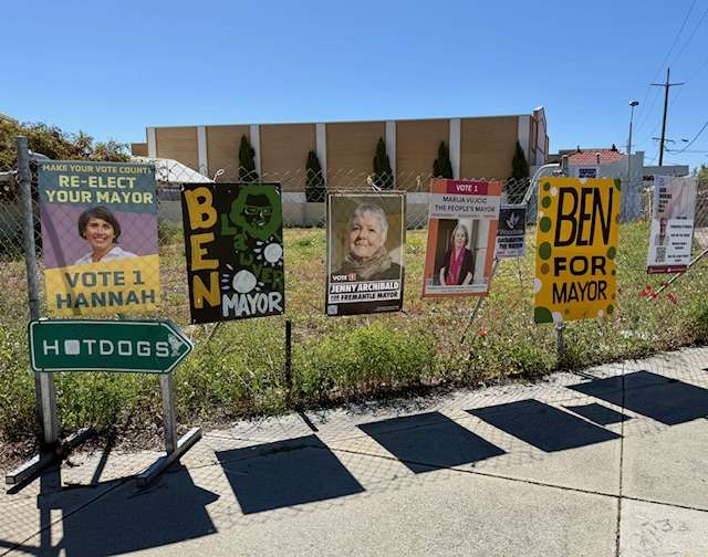 Freo Today. 7 October 2025. These five Mayoral candidates (one featured twice) debated last night at Tannock Hall, University of Notre Dame Australia. It was a lively debate. Unlike the option provided in this pic, to go that way ➡️ for a hotdog, members of the audience last night were only offered plain tea and dry biscuits in the foyer when the doing was done!